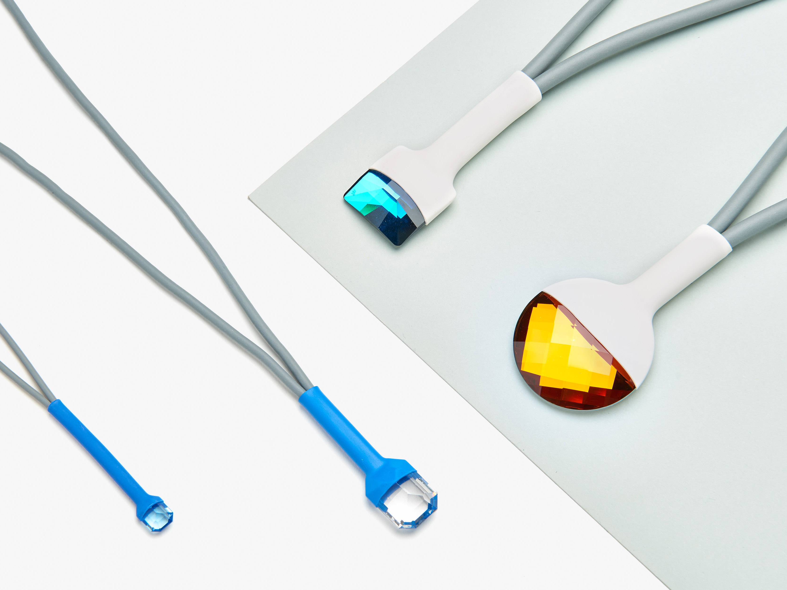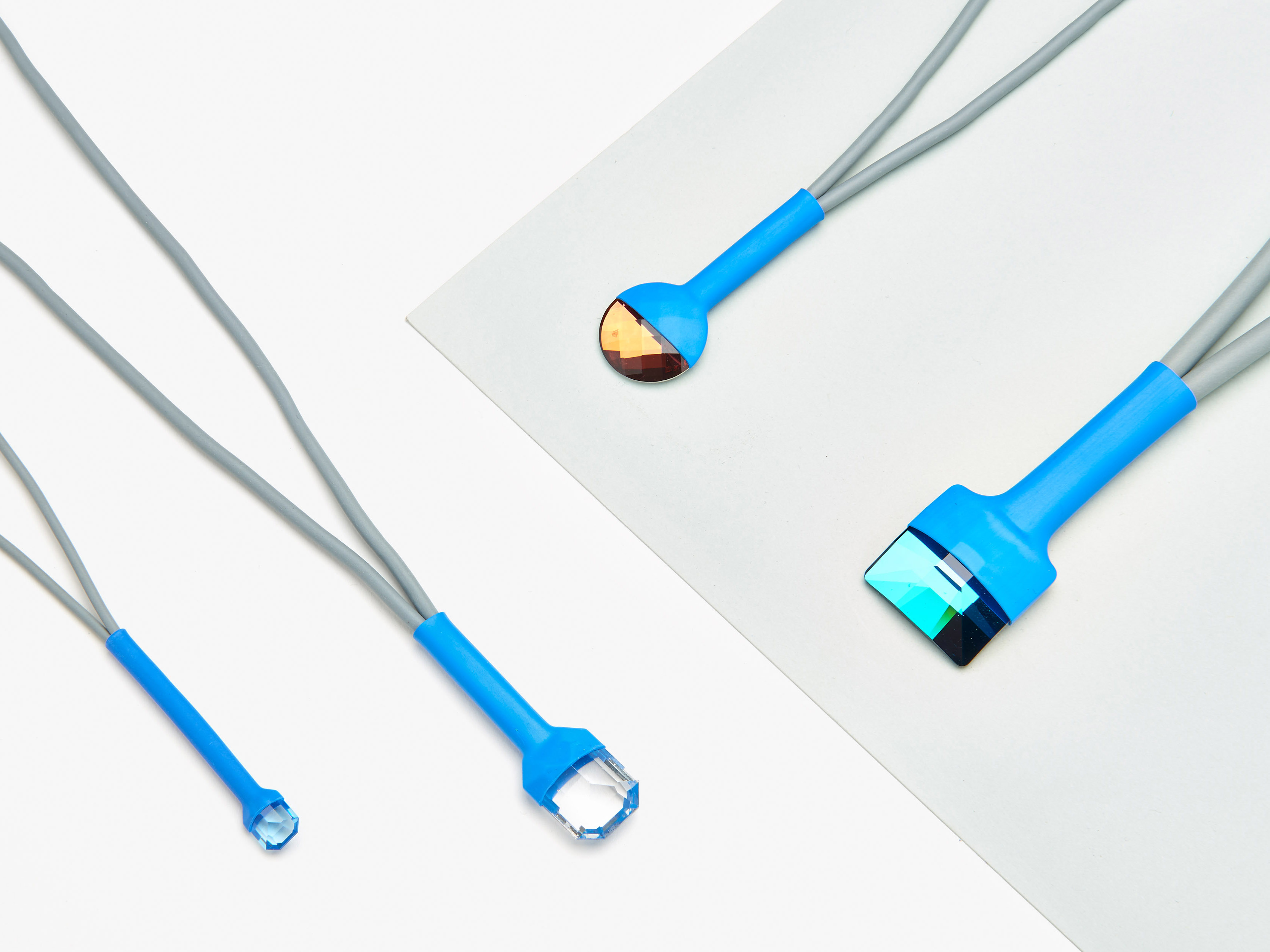 Electric → All Projects 1 / 9 Zoom Collection of Necklaces combining Swarovski crystals with colorful electric heat-shrinkable sleeves.