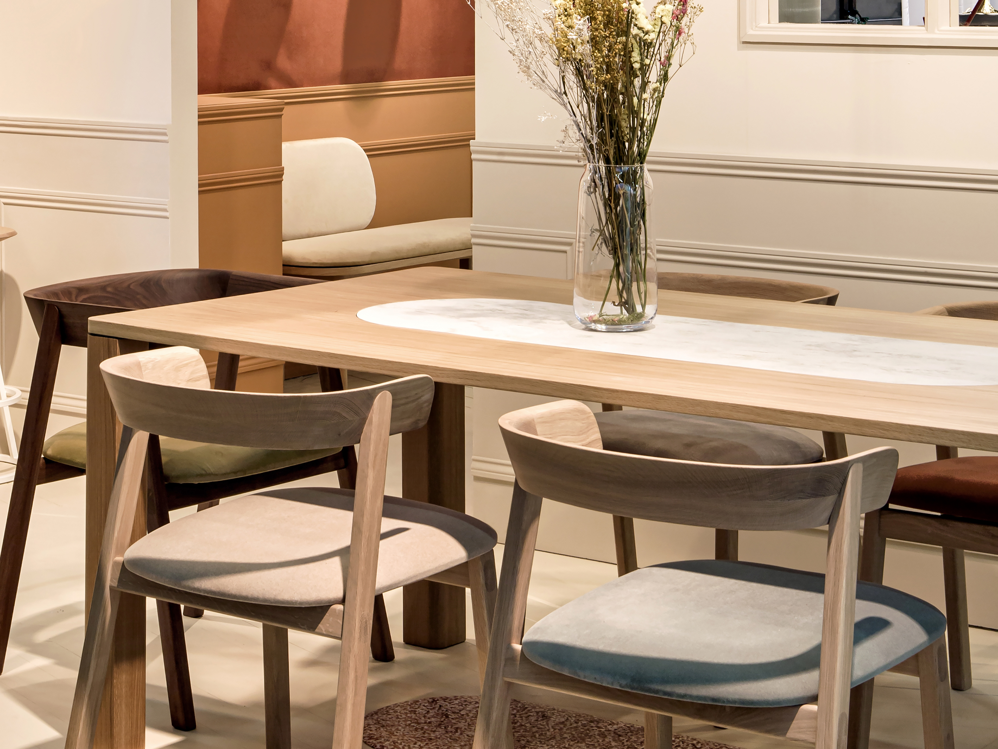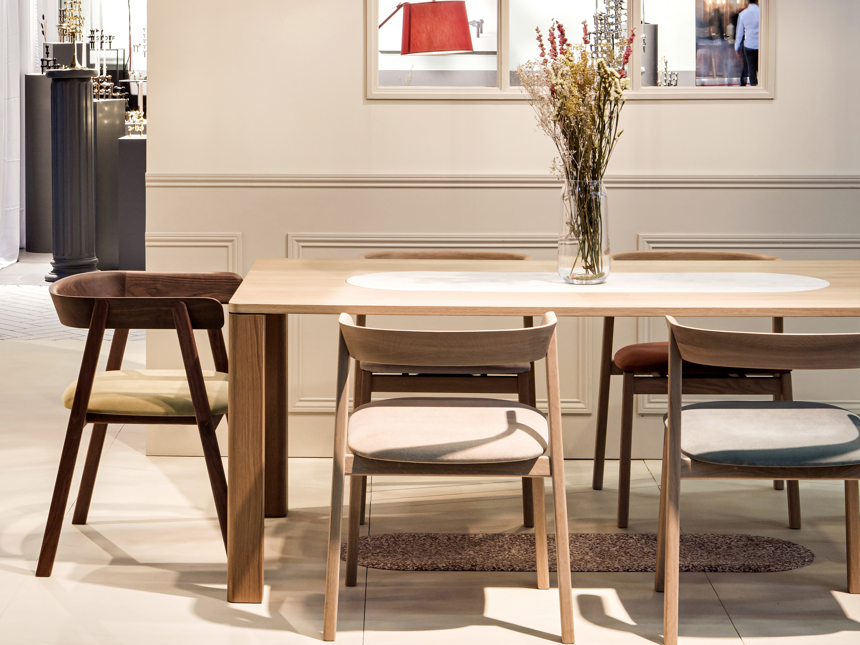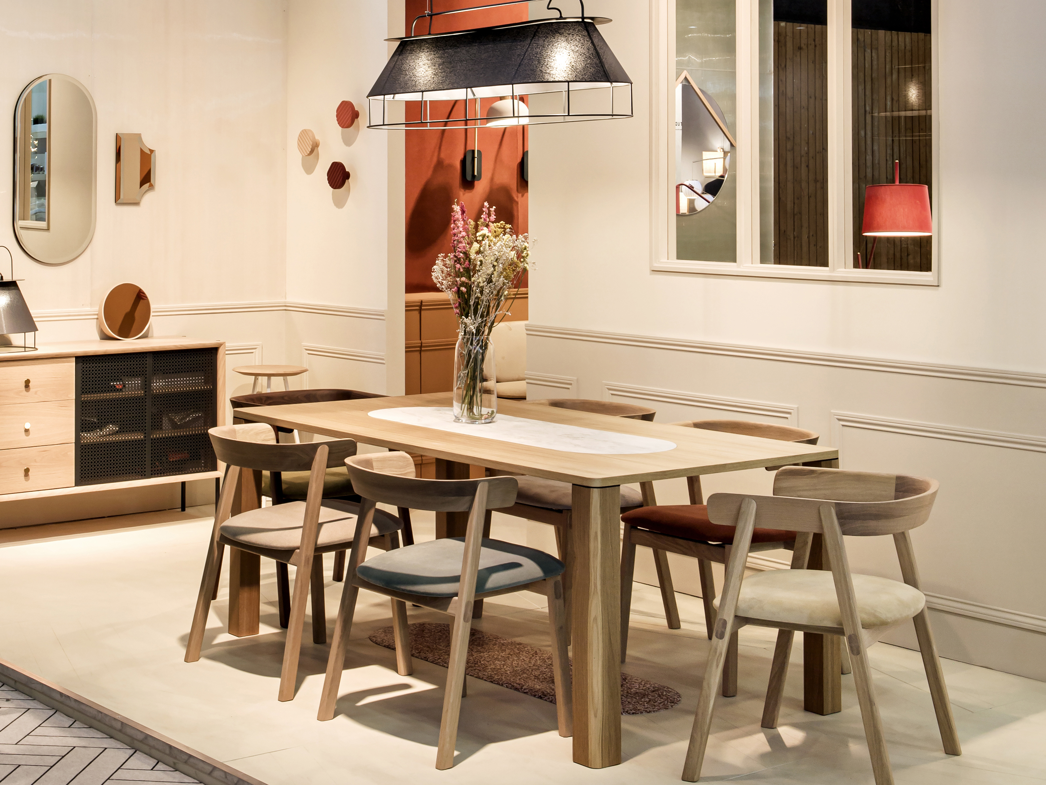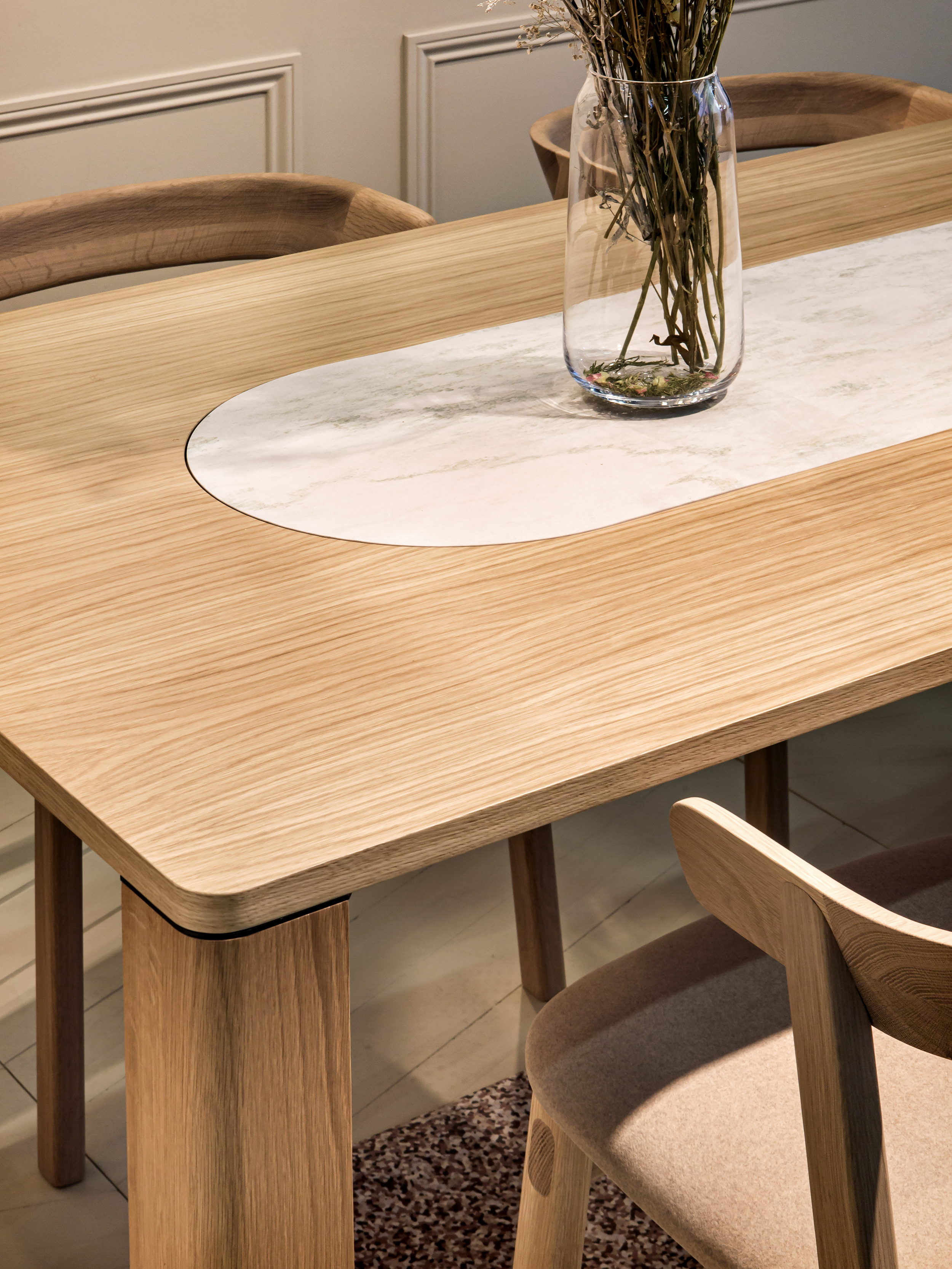 → All ProjectsGarance is a wood dinning table designed for the French design editor and brand – Hartô. Generously sized, this table is ideal for family diners and big living spaces. A delicate and graphic structure of the table contrast with the imposing legs. A central tabletop element resting on a resistant oak wood structure and can be changed according to your inspiration. This central piece is available in different materials: terrazzo, glass, metal, wood & stone.