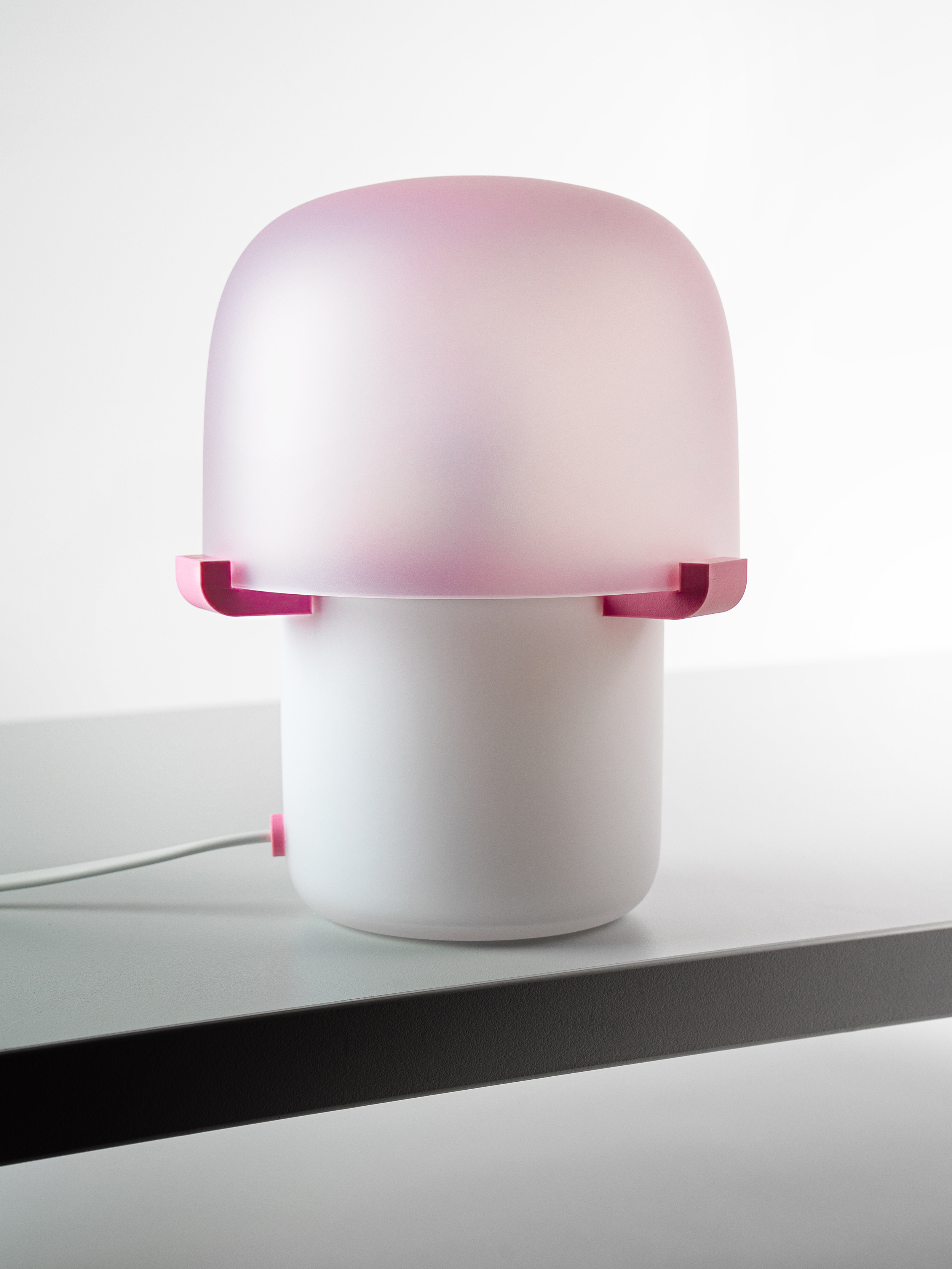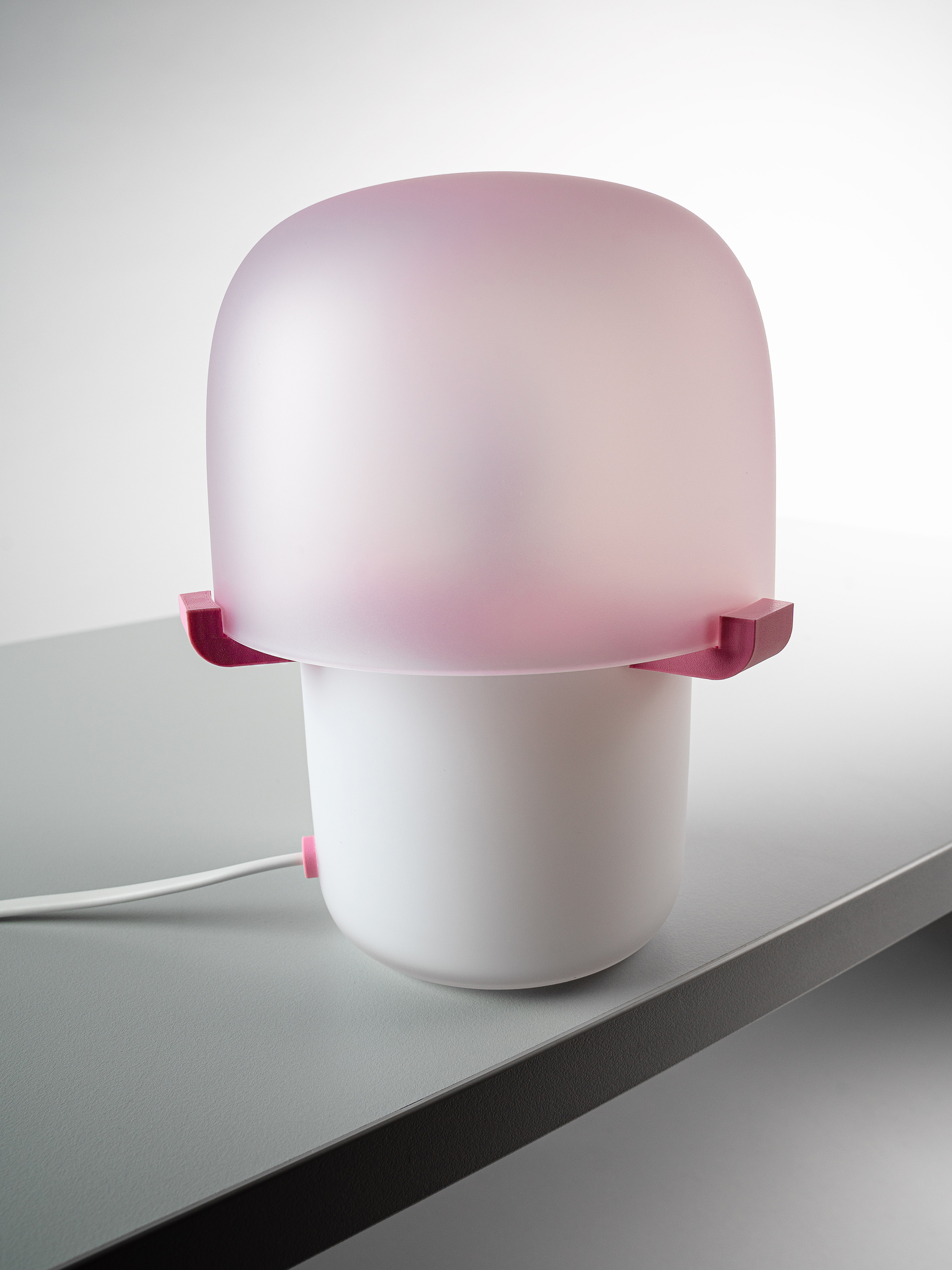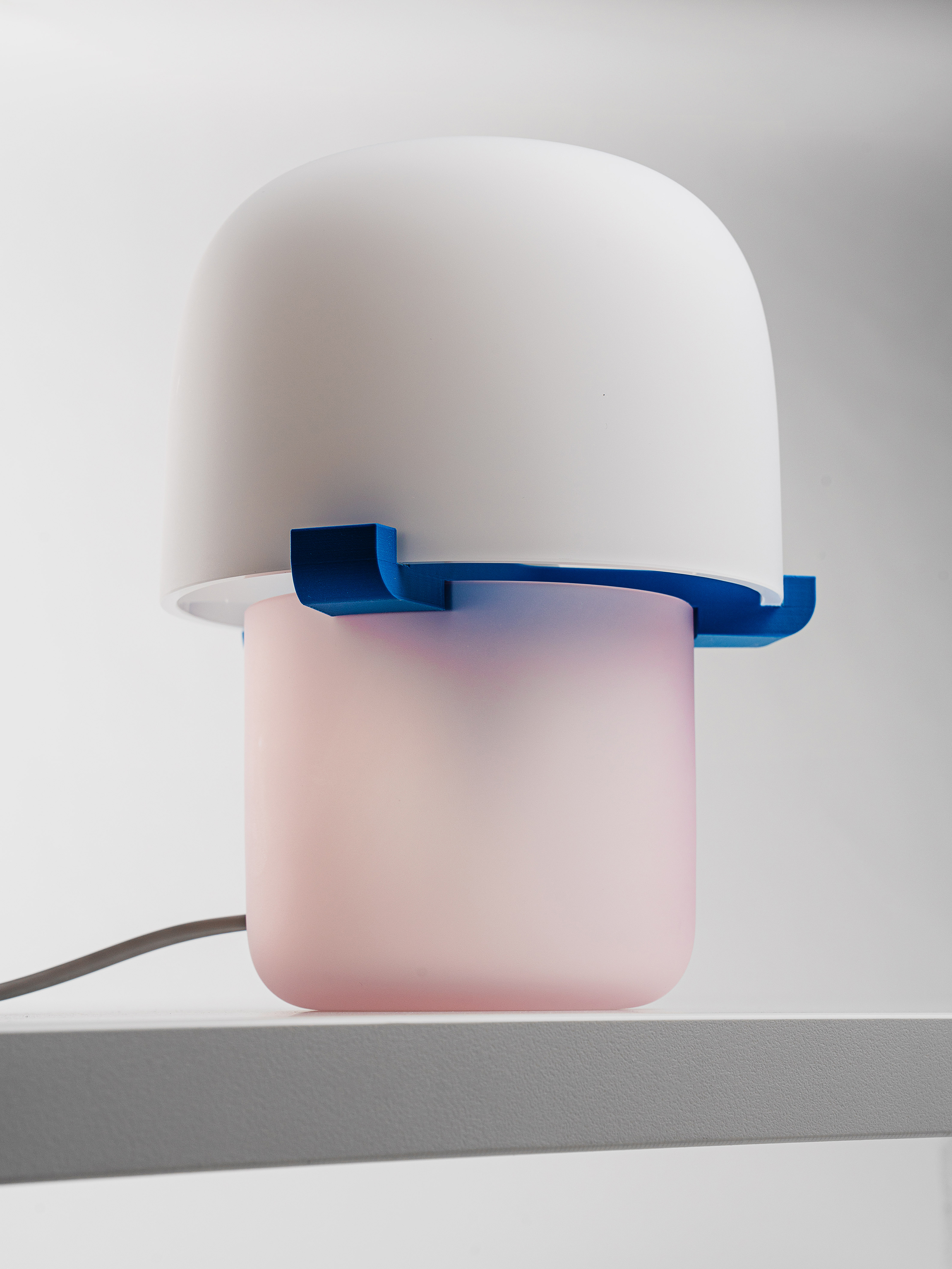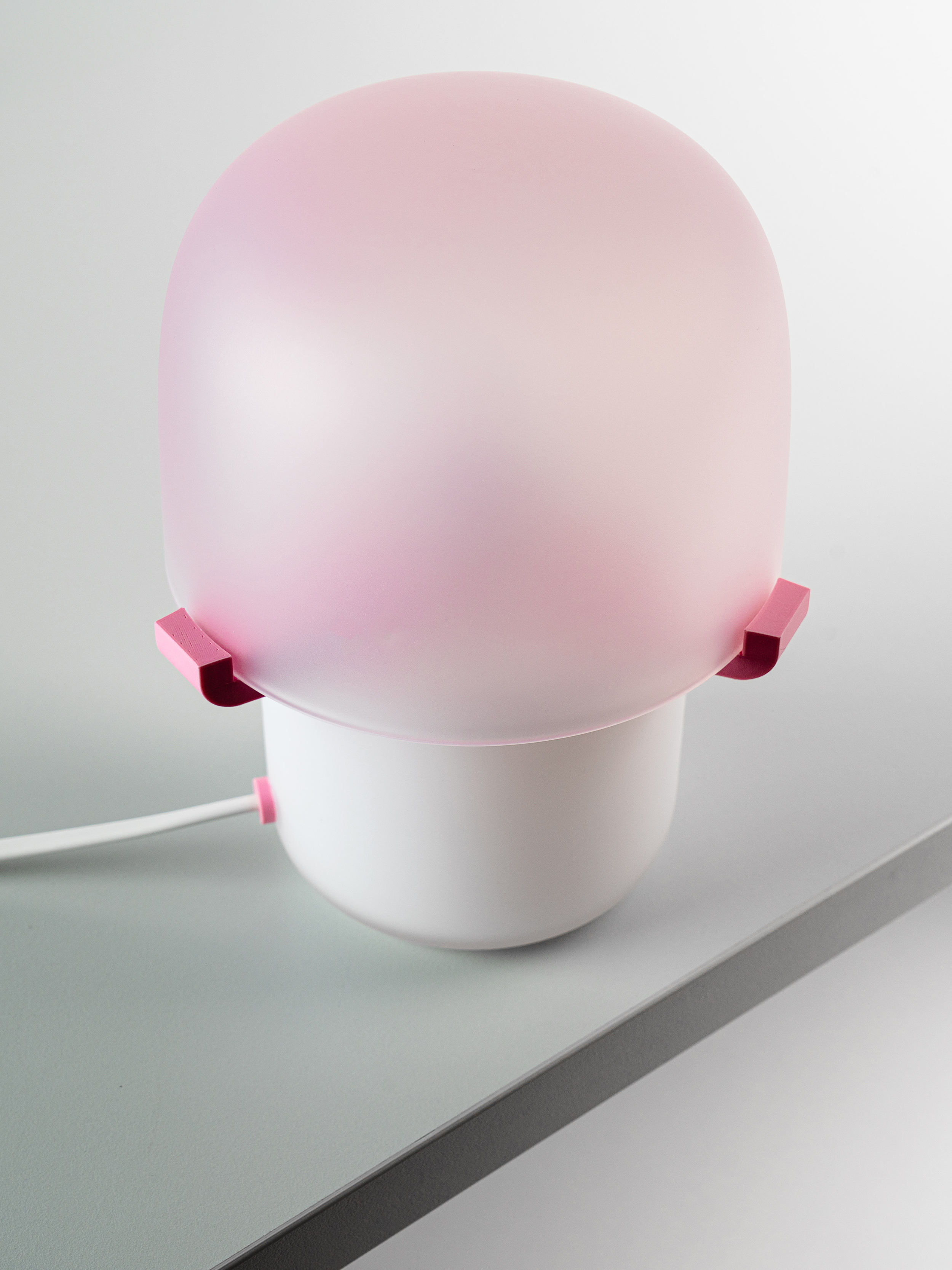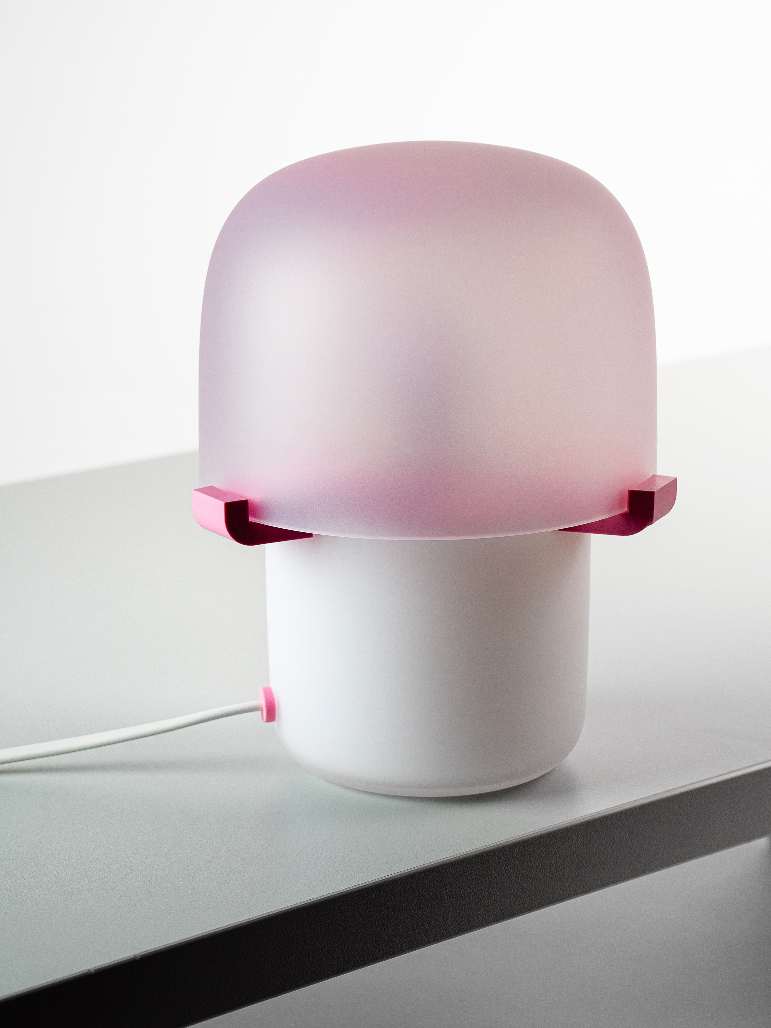 → All ProjectsMellow is a table lamp with a minimalist and poetic design, inspired by the soft and comforting shape of a candy. Made from two glass components held together by a central star-shaped piece that houses the light bulb, Mellow combines structural simplicity with visual delicacy. The lamp’s form is reduced to its essence — soft, rounded volumes that gently diffuse the light through satin-finished glass. The central star-shaped connector plays a dual role: both functional and aesthetic. It keeps the glass parts securely in place while allowing for an easy assembly, emphasizing the lamp’s simple yet clever construction.