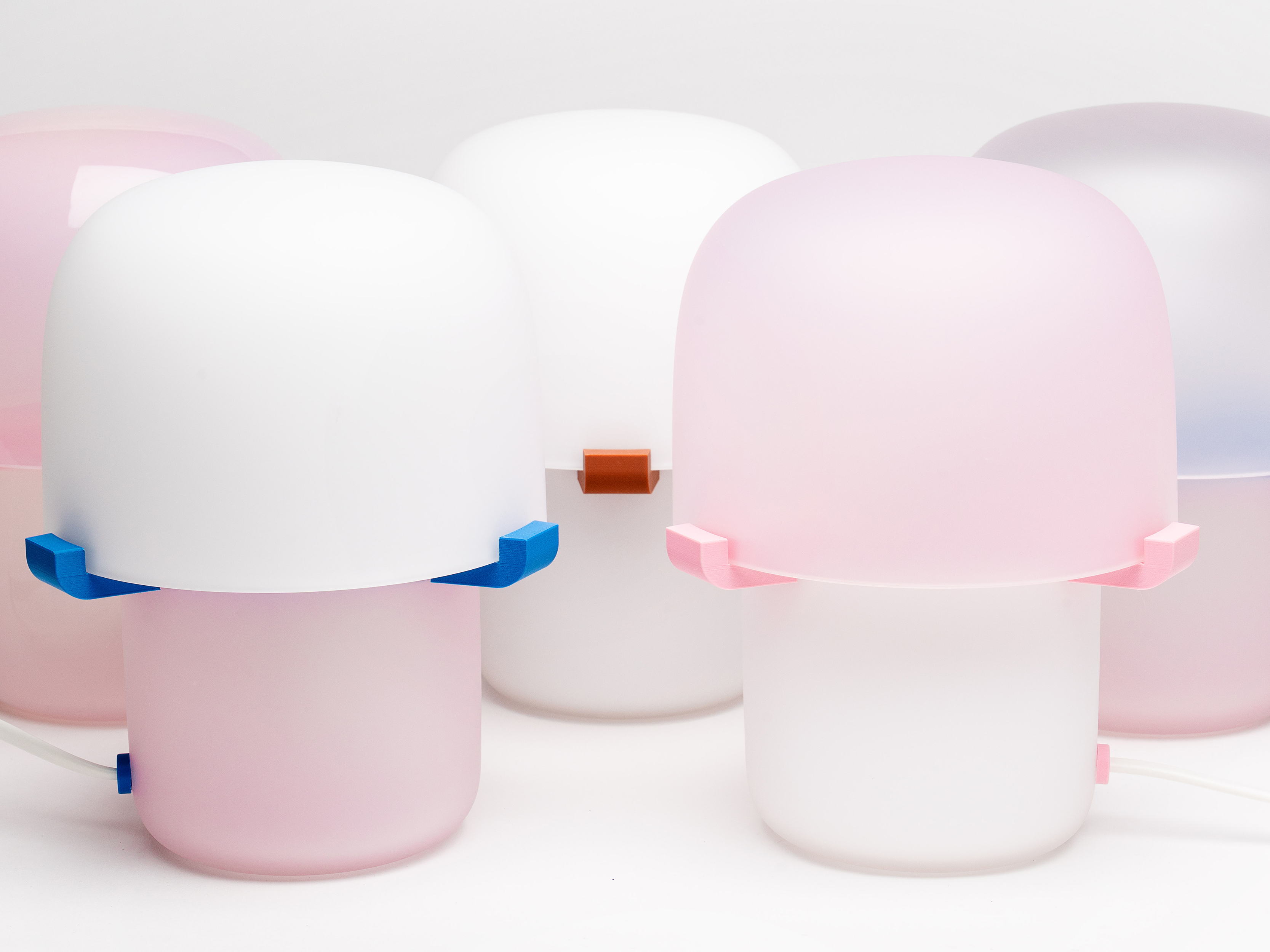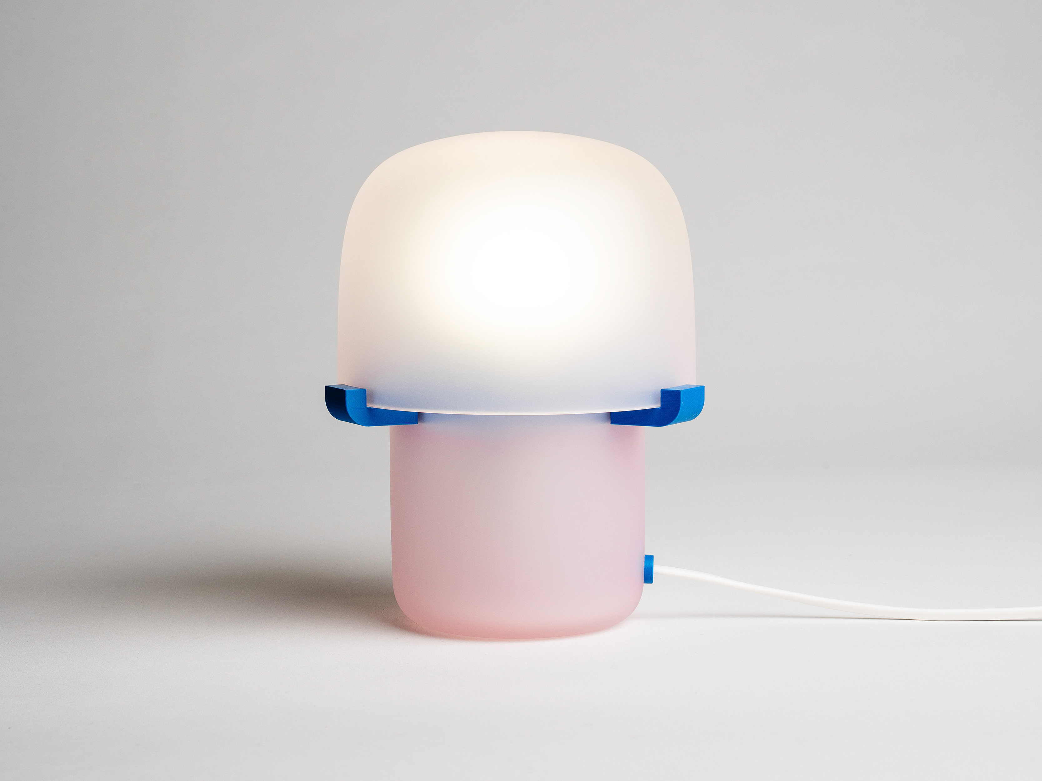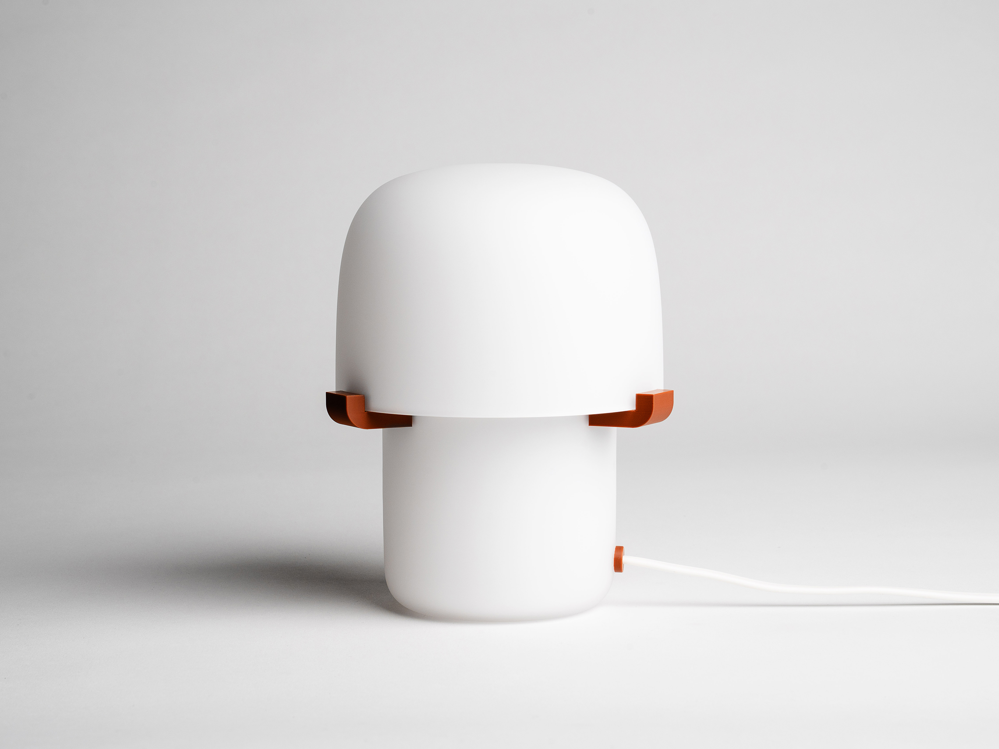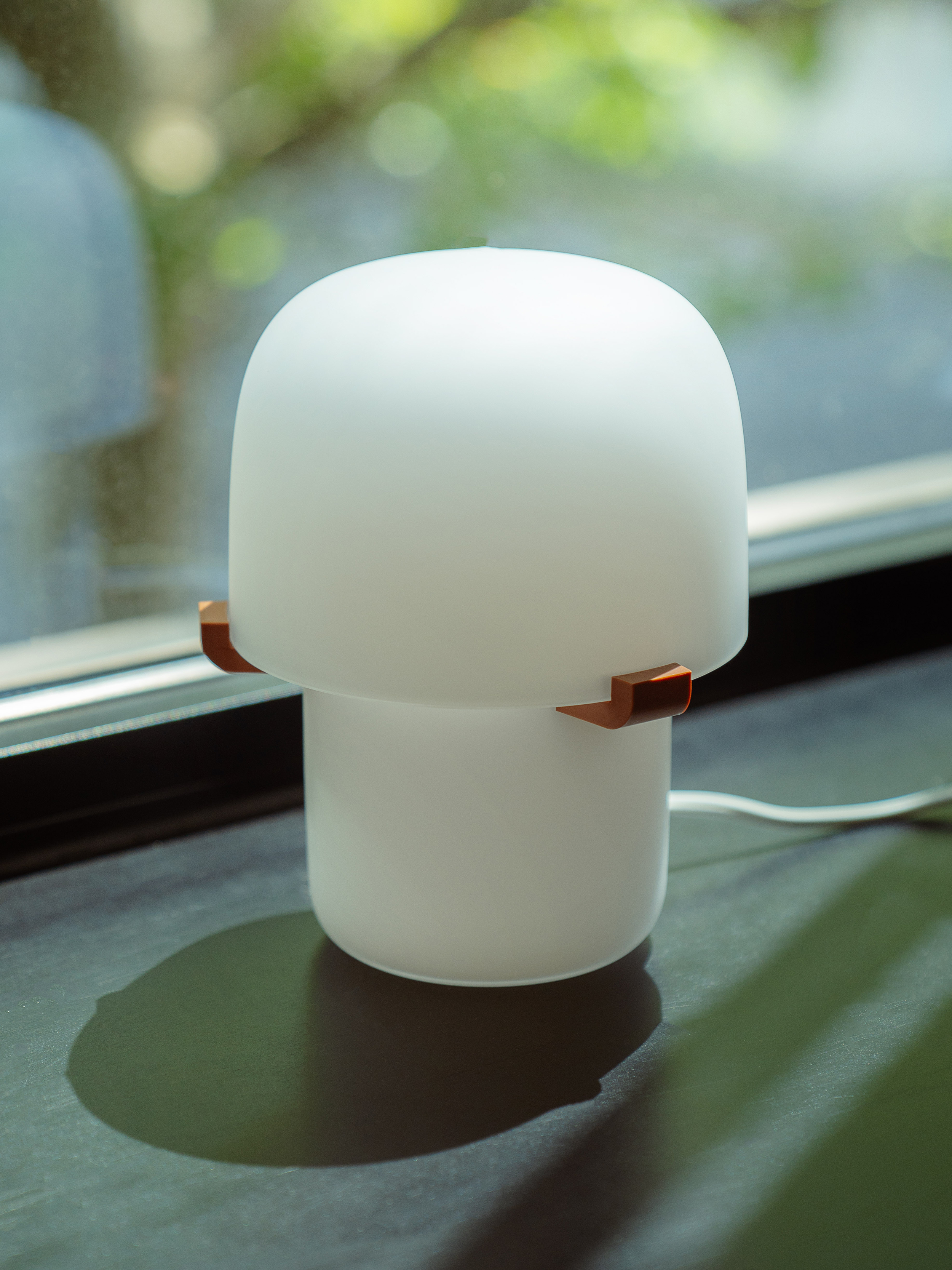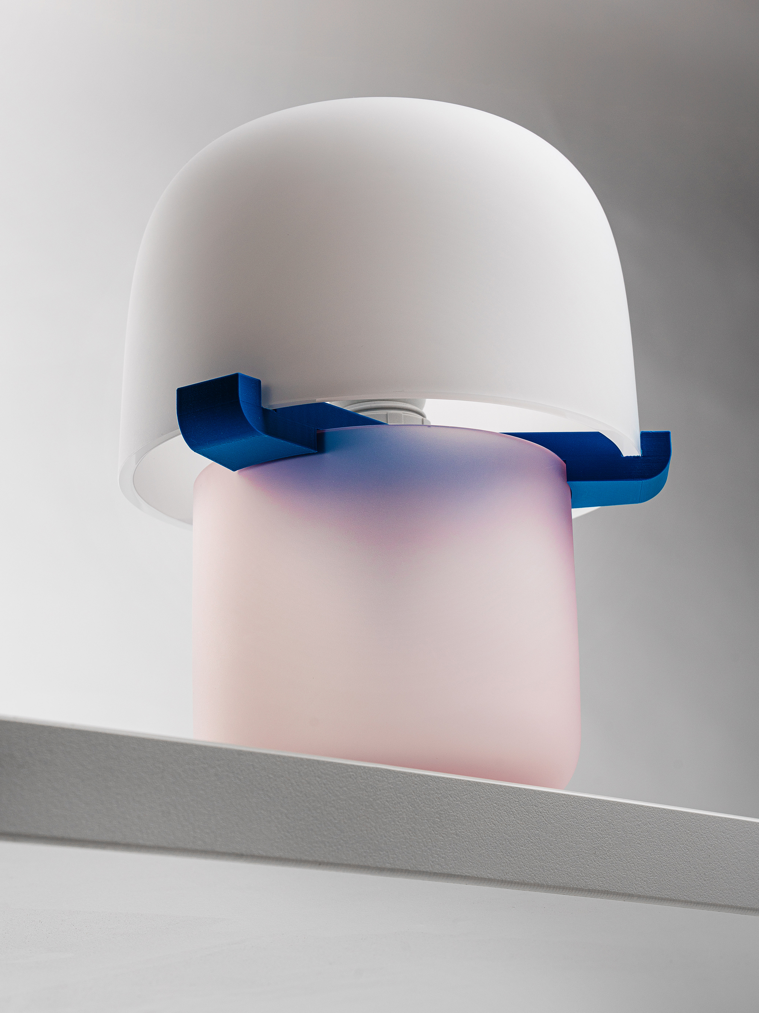 → All ProjectsMellow is a table lamp with a minimalist and poetic design, inspired by the soft and comforting shape of a candy. Made from two glass components held together by a central star-shaped piece that houses the light bulb, Mellow combines structural simplicity with visual delicacy. The lamp’s form is reduced to its essence — soft, rounded volumes that gently diffuse the light through satin-finished glass. The central star-shaped connector plays a dual role: both functional and aesthetic. It keeps the glass parts securely in place while allowing for an easy assembly, emphasizing the lamp’s simple yet clever construction.