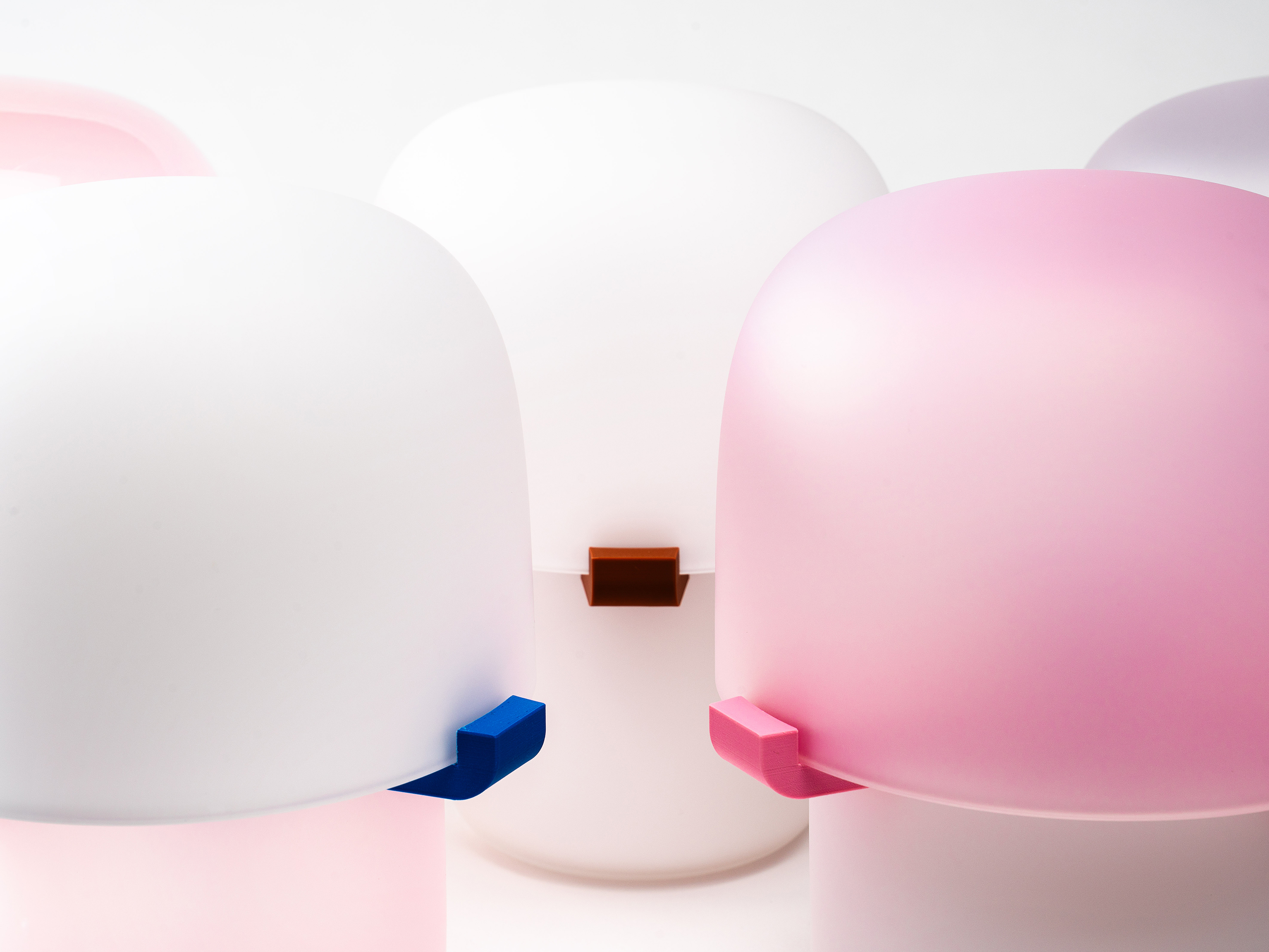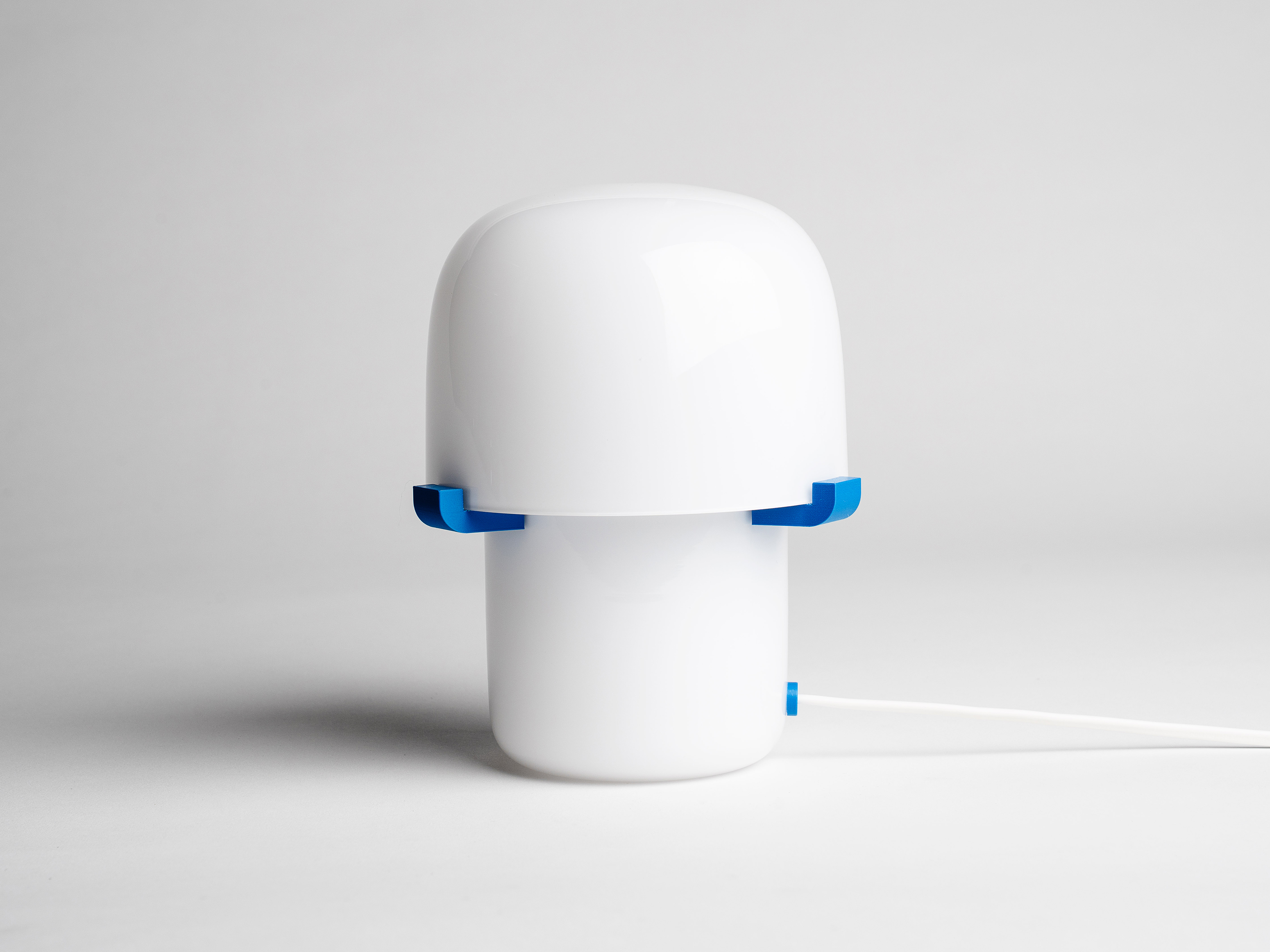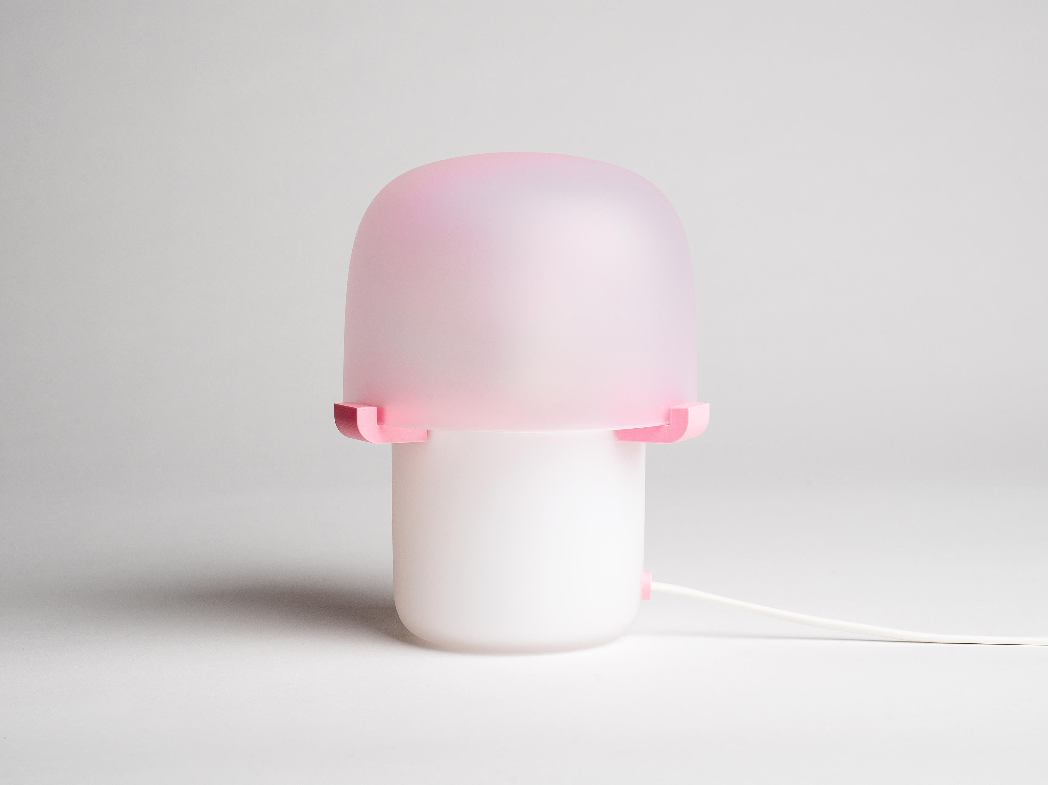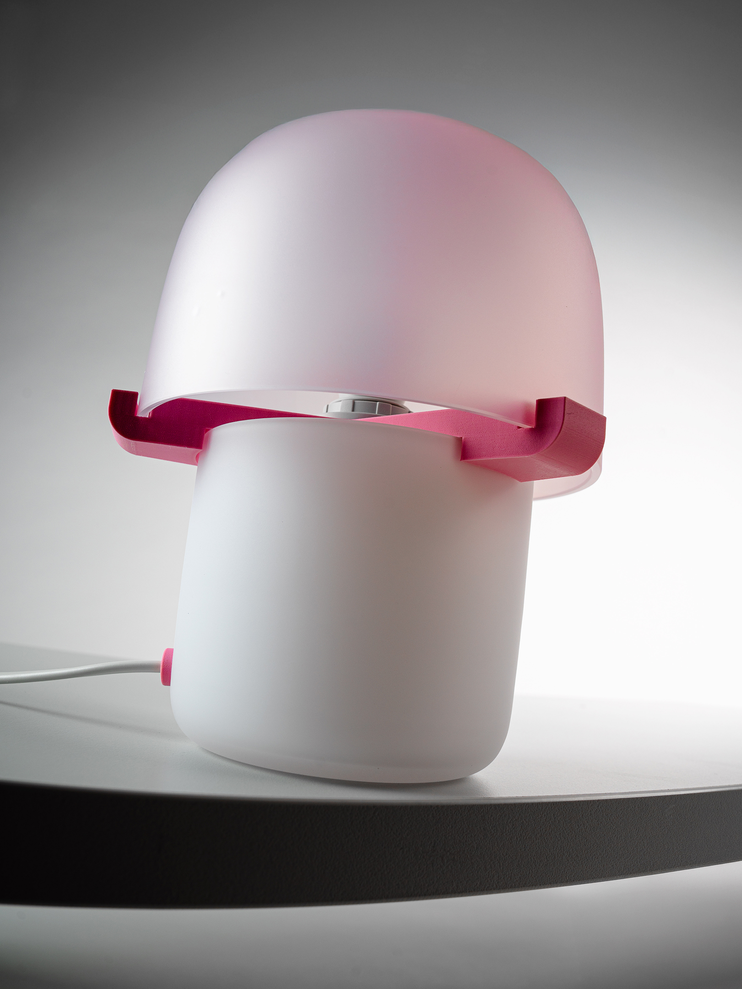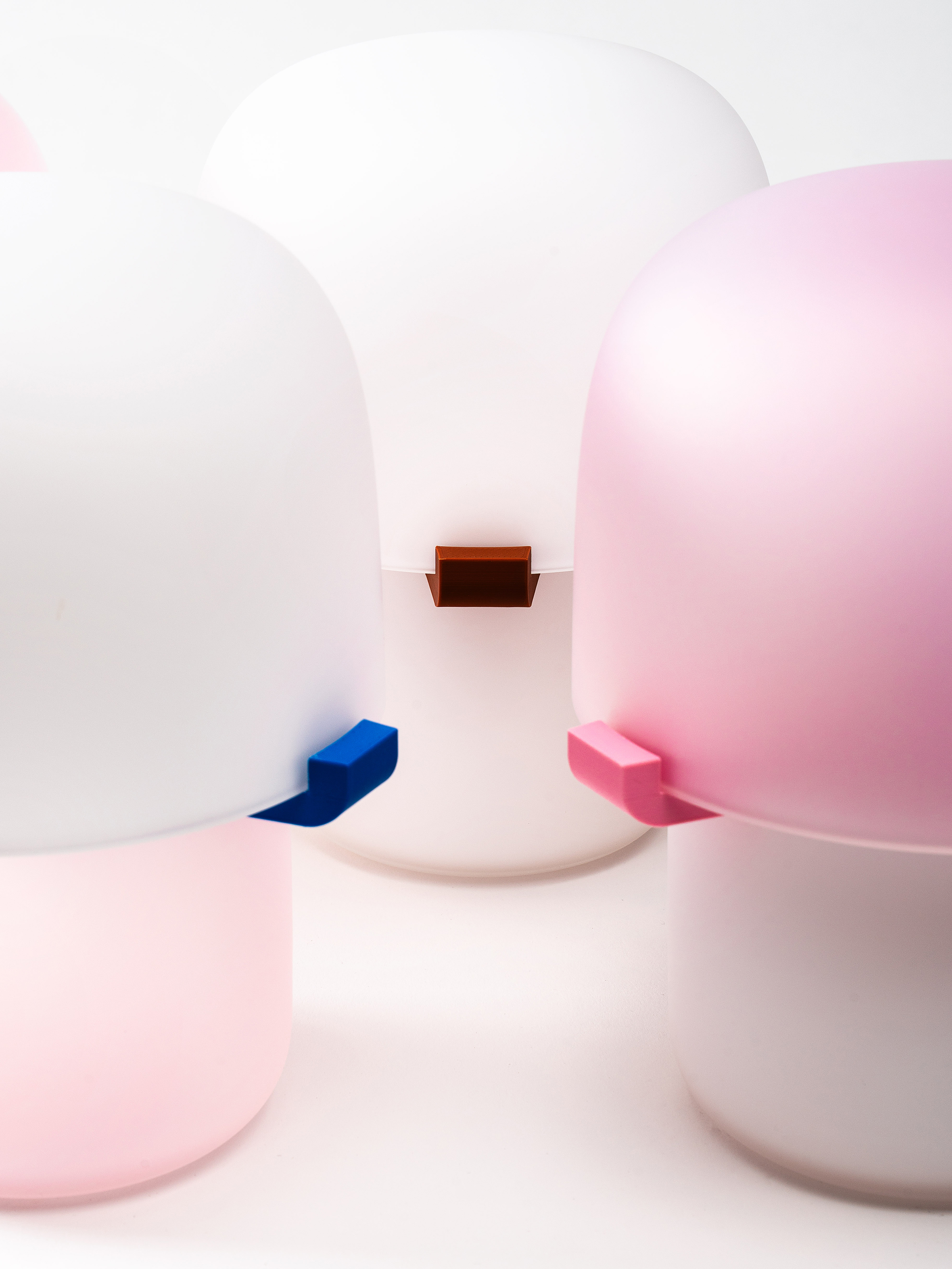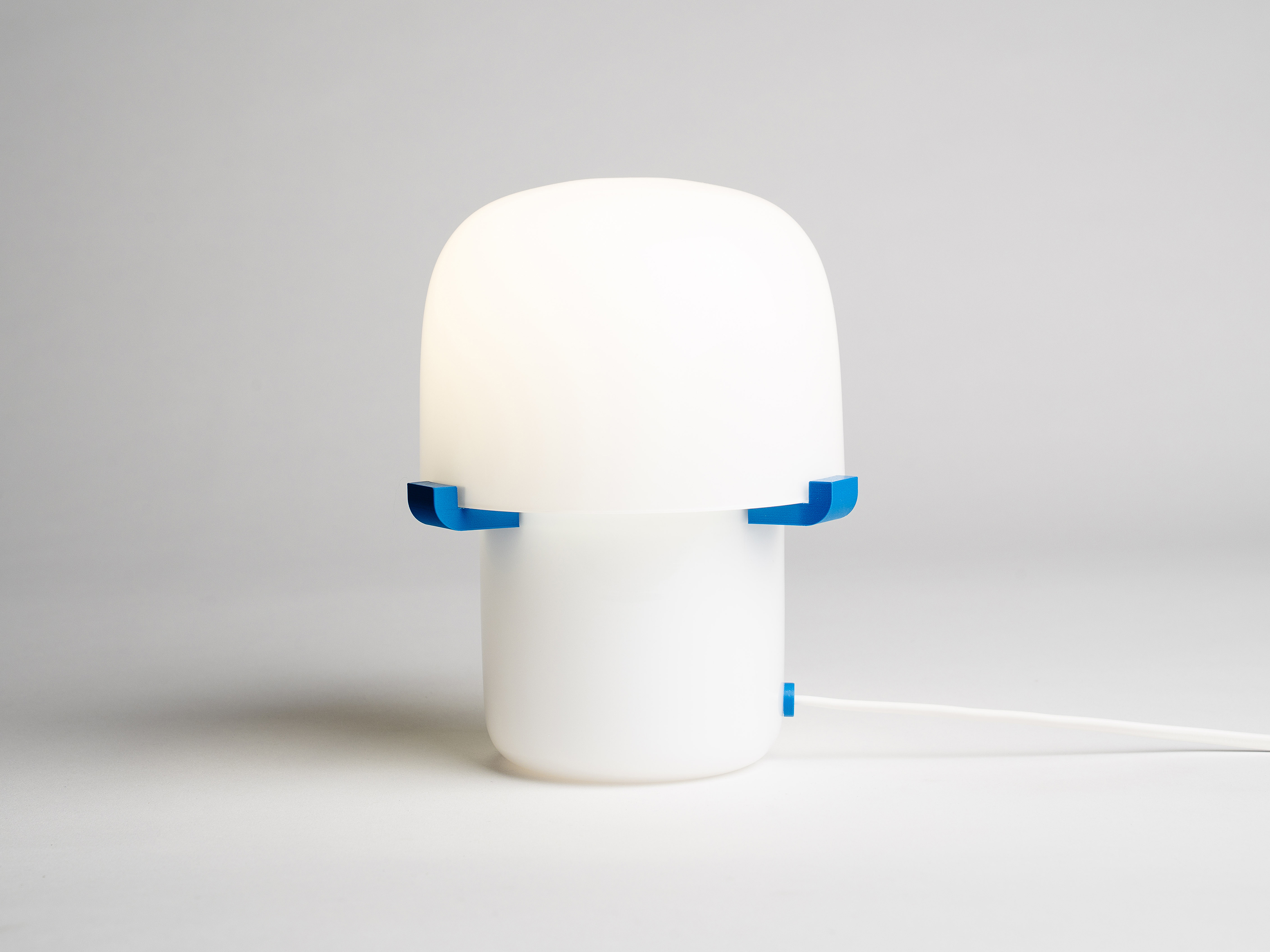 → All ProjectsMellow is a table lamp with a minimalist and poetic design, inspired by the soft and comforting shape of a candy. Made from two glass components held together by a central star-shaped piece that houses the light bulb, Mellow combines structural simplicity with visual delicacy. The lamp’s form is reduced to its essence — soft, rounded volumes that gently diffuse the light through satin-finished glass. The central star-shaped connector plays a dual role: both functional and aesthetic. It keeps the glass parts securely in place while allowing for an easy assembly, emphasizing the lamp’s simple yet clever construction.