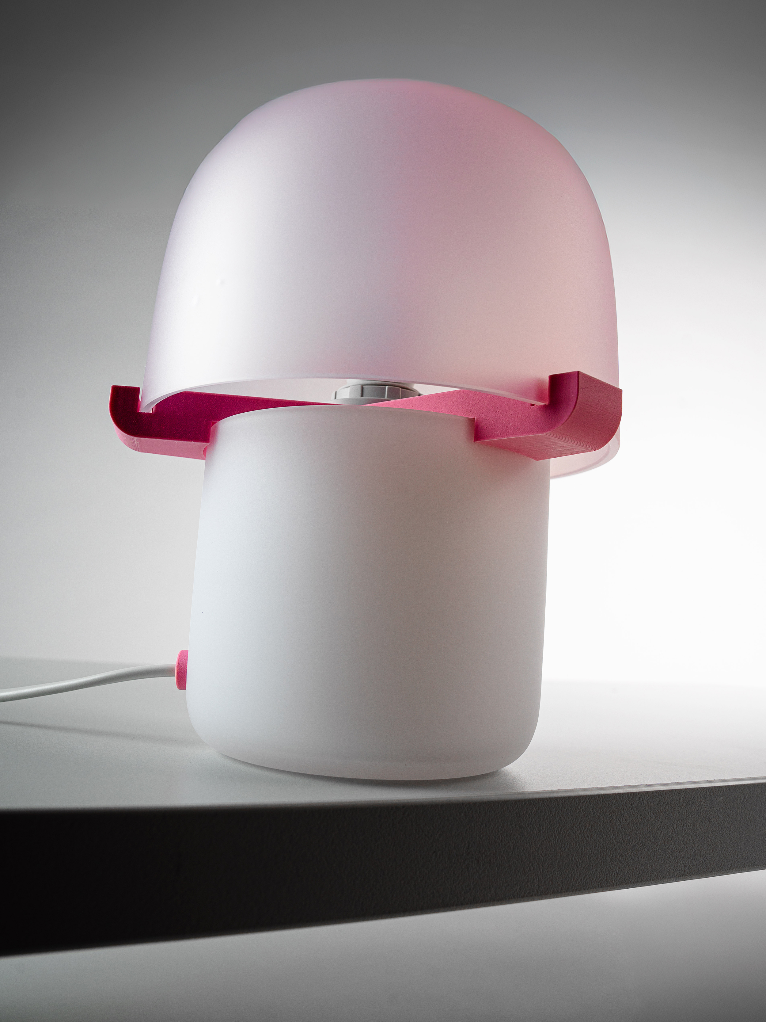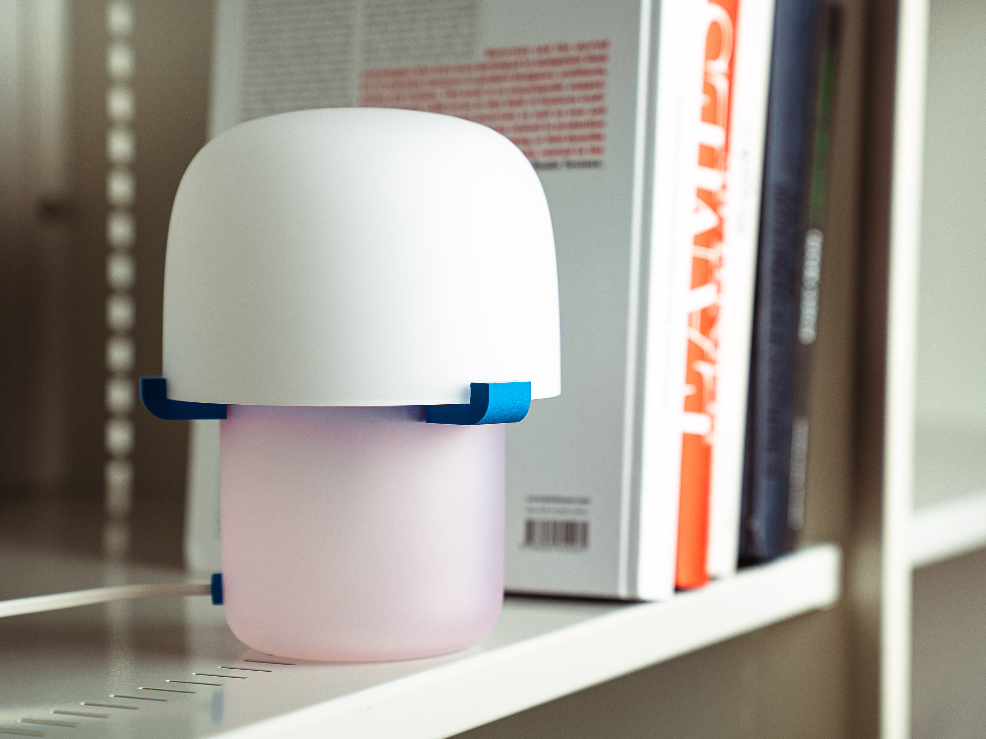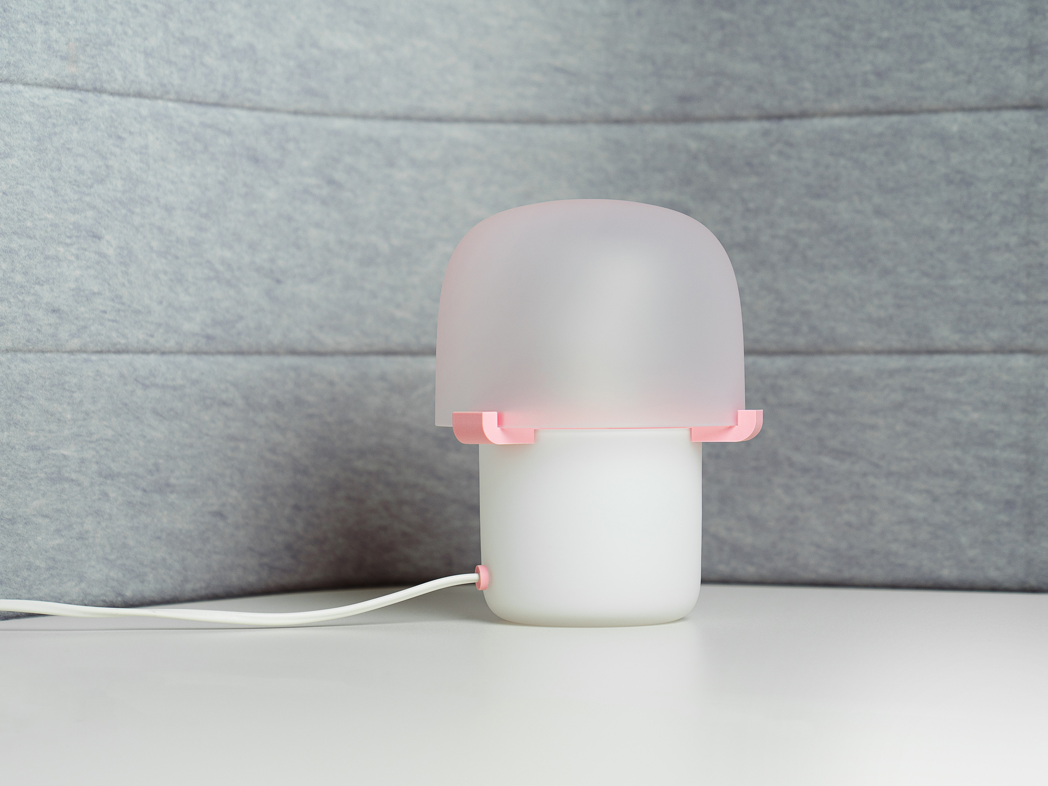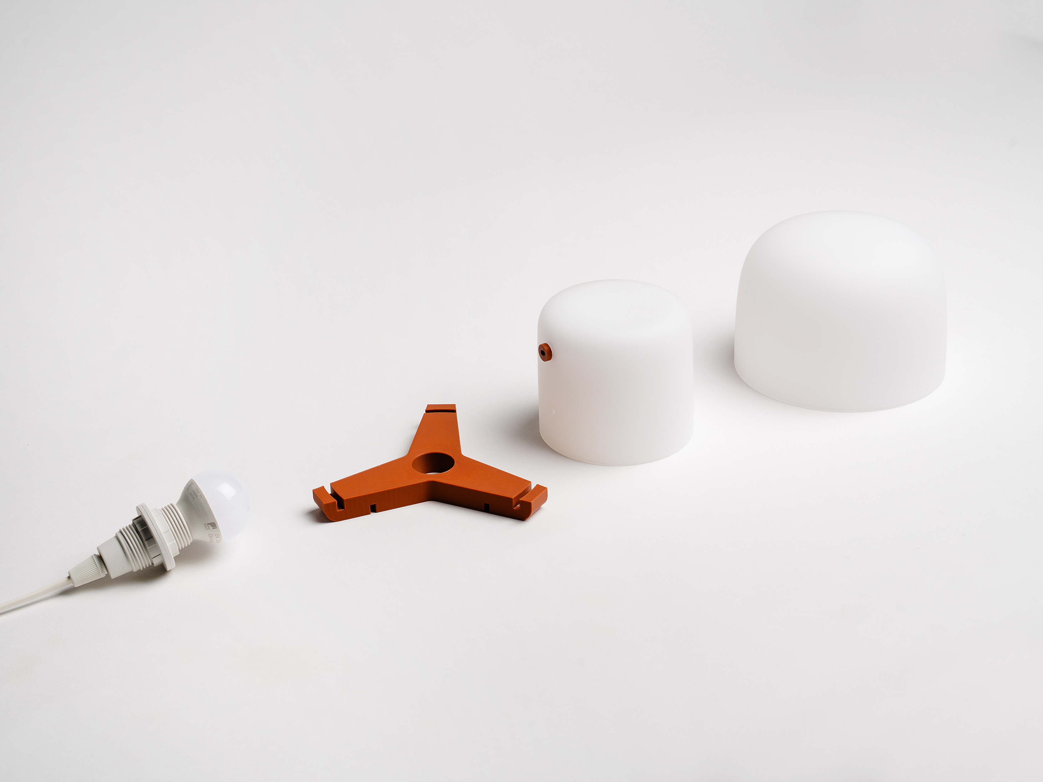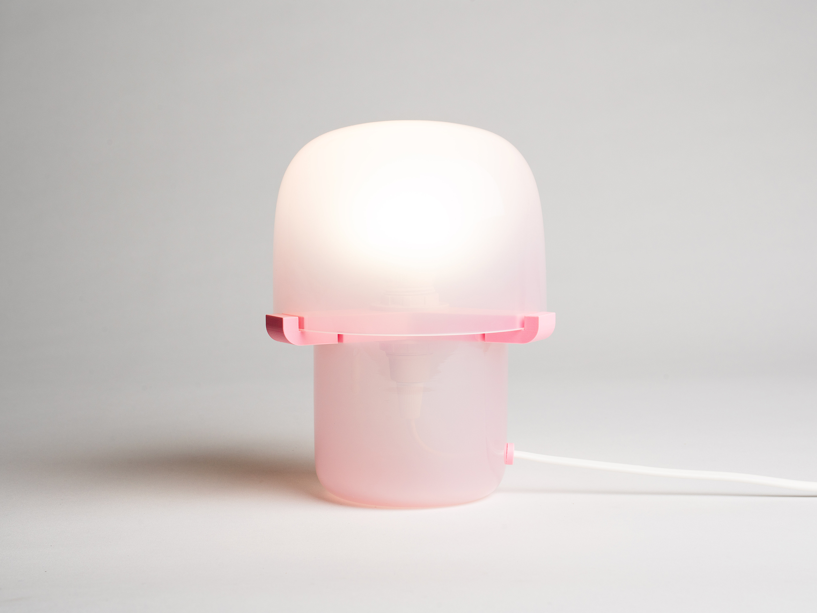 → All ProjectsMellow is a table lamp with a minimalist and poetic design, inspired by the soft and comforting shape of a candy. Made from two glass components held together by a central star-shaped piece that houses the light bulb, Mellow combines structural simplicity with visual delicacy. The lamp’s form is reduced to its essence — soft, rounded volumes that gently diffuse the light through satin-finished glass. The central star-shaped connector plays a dual role: both functional and aesthetic. It keeps the glass parts securely in place while allowing for an easy assembly, emphasizing the lamp’s simple yet clever construction.