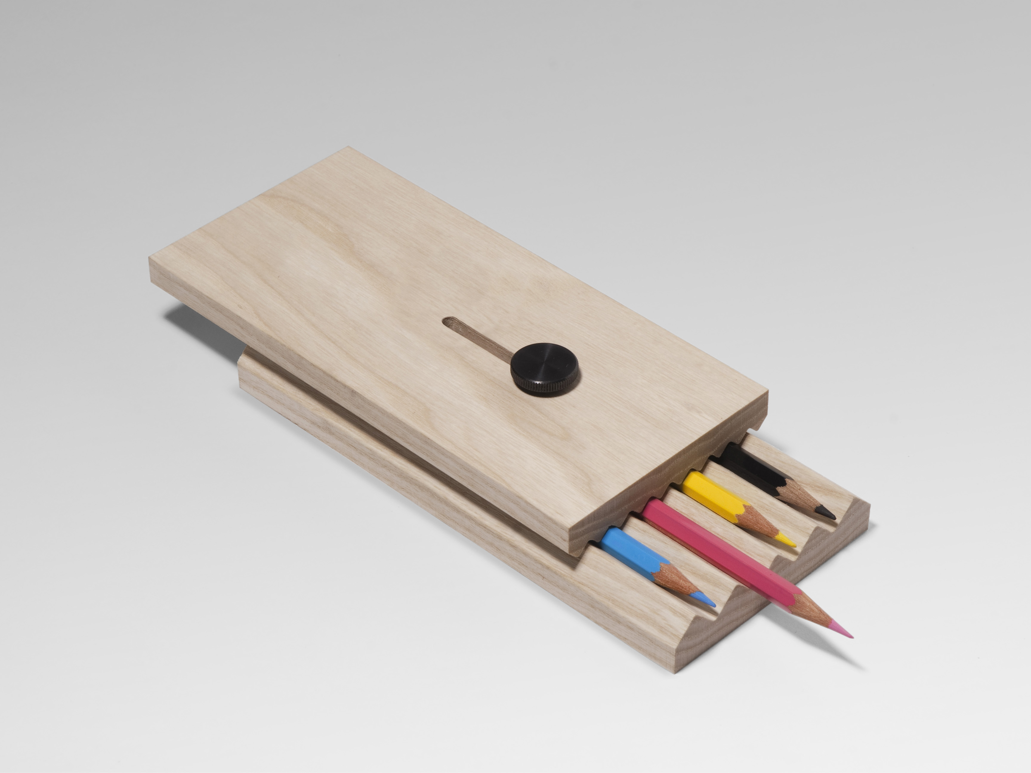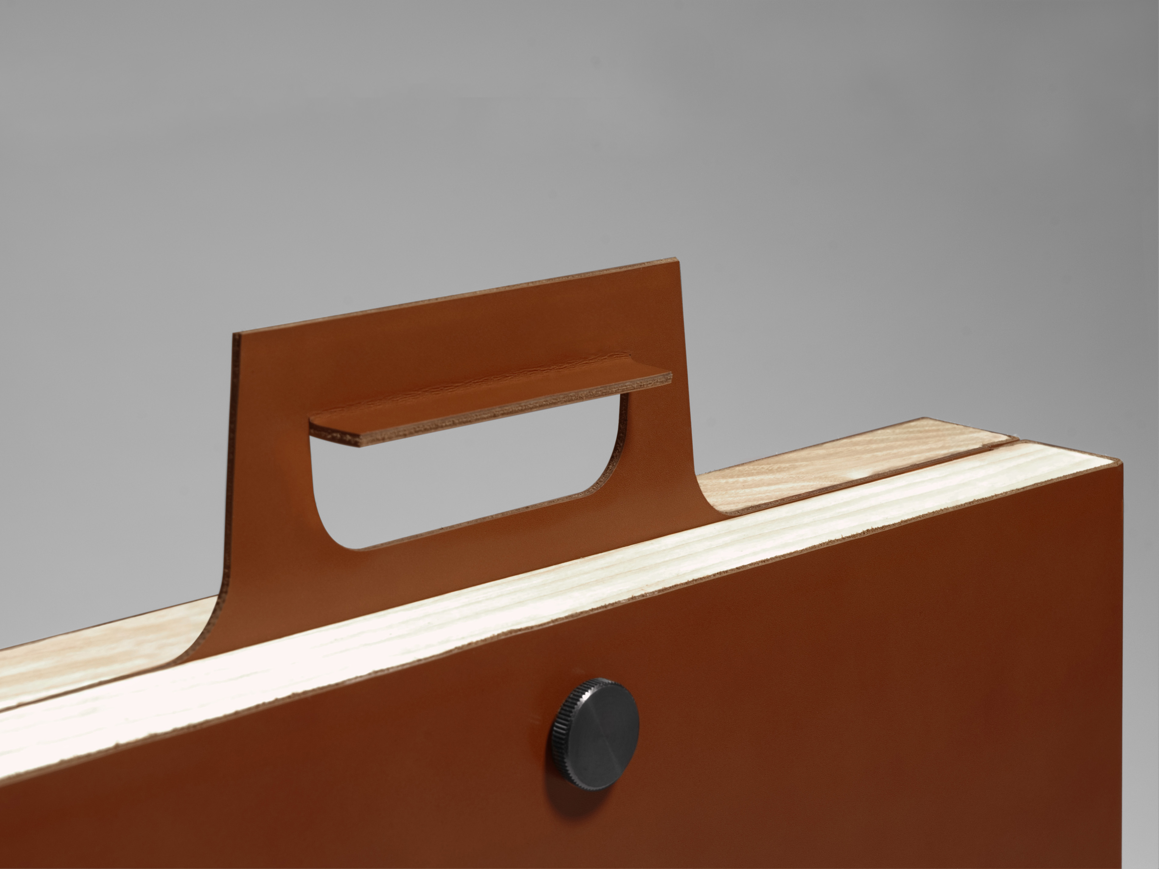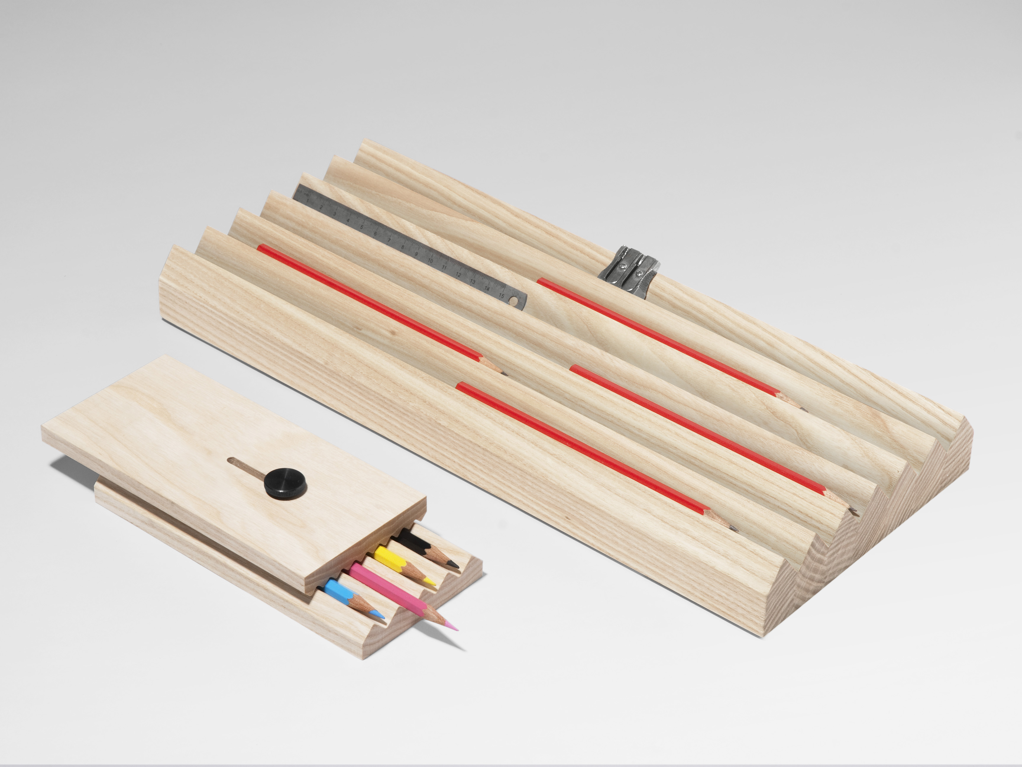 → All ProjectsThe monster collection contains a case for 4 pencils, a wooden block for storing writing utensils & a A3 leather bag. This collection was named monster after our chance encounter with avertical shaper in the woodworking workshop of Joseph Miele. After many weeks of mutual observation, communication was finaly established. Each one of our objects is sculpted by each of its jaws. We have rendered the shape of its teeths to enclose pencils - “stuffmonster”. We have rendered the strenght of its teeths with a black screw to lock in some pencils - “penmonster”. We have rendered its skin to make a bag - “papermonster”. Collaboration with Camille Blin.