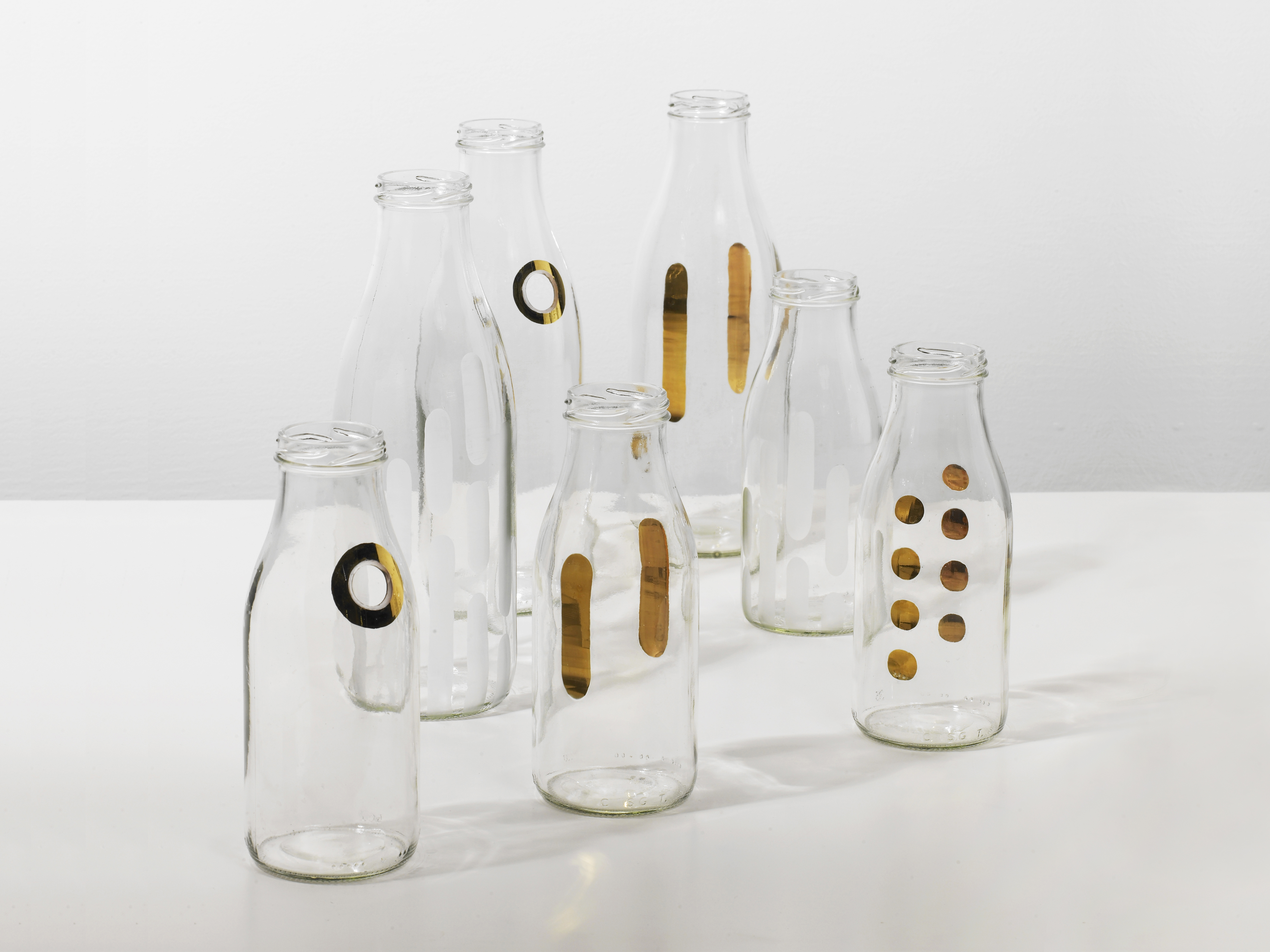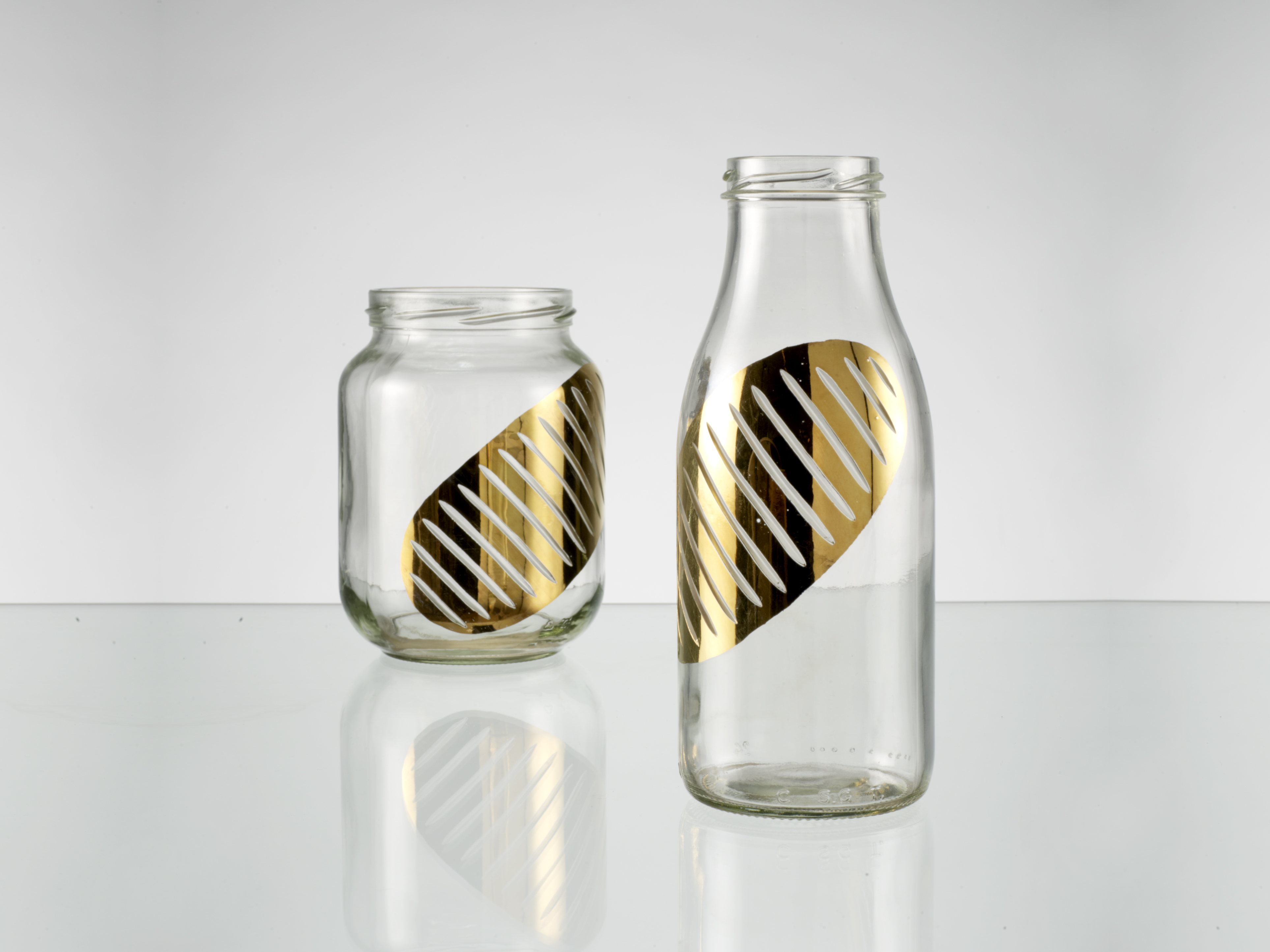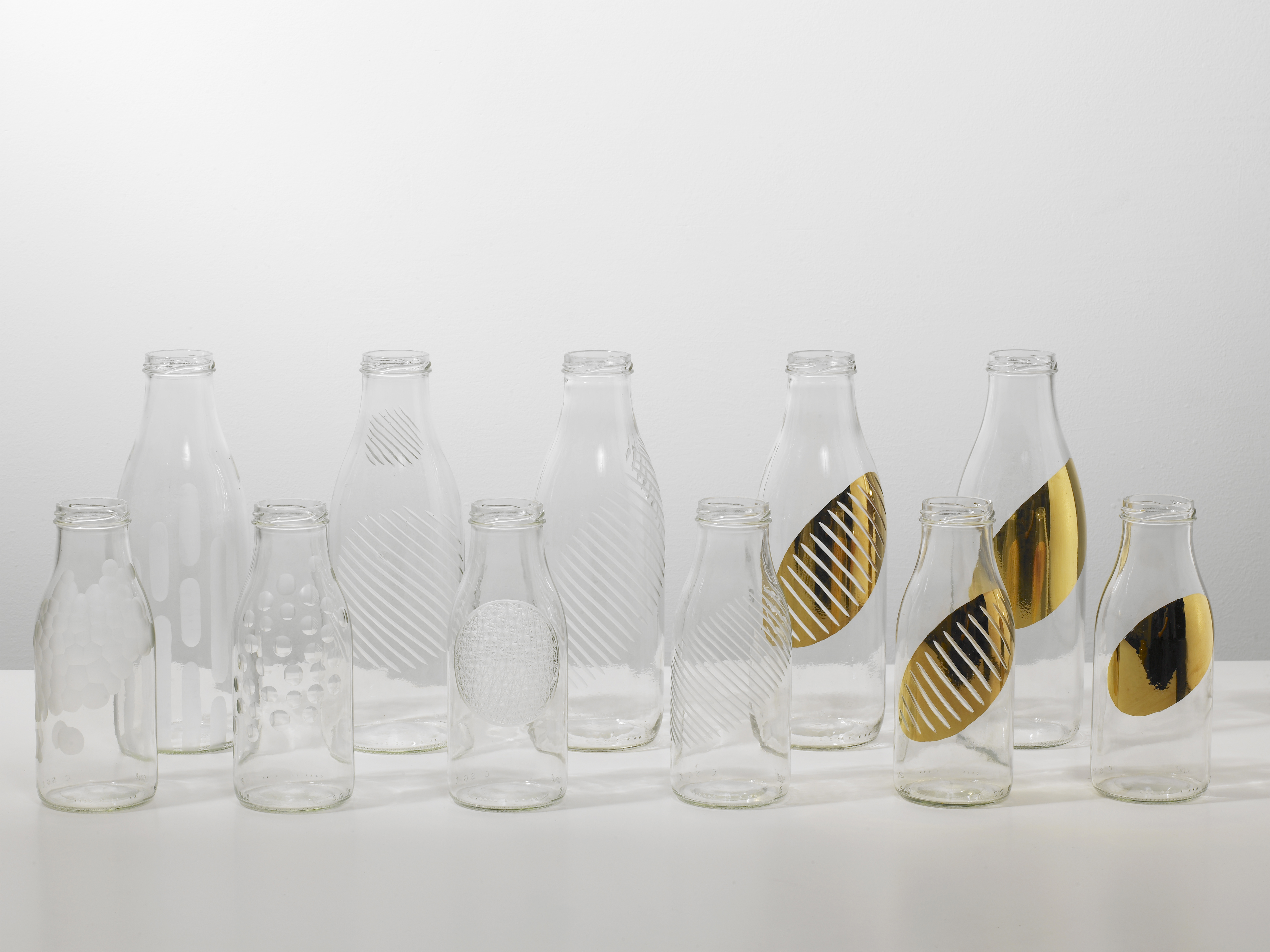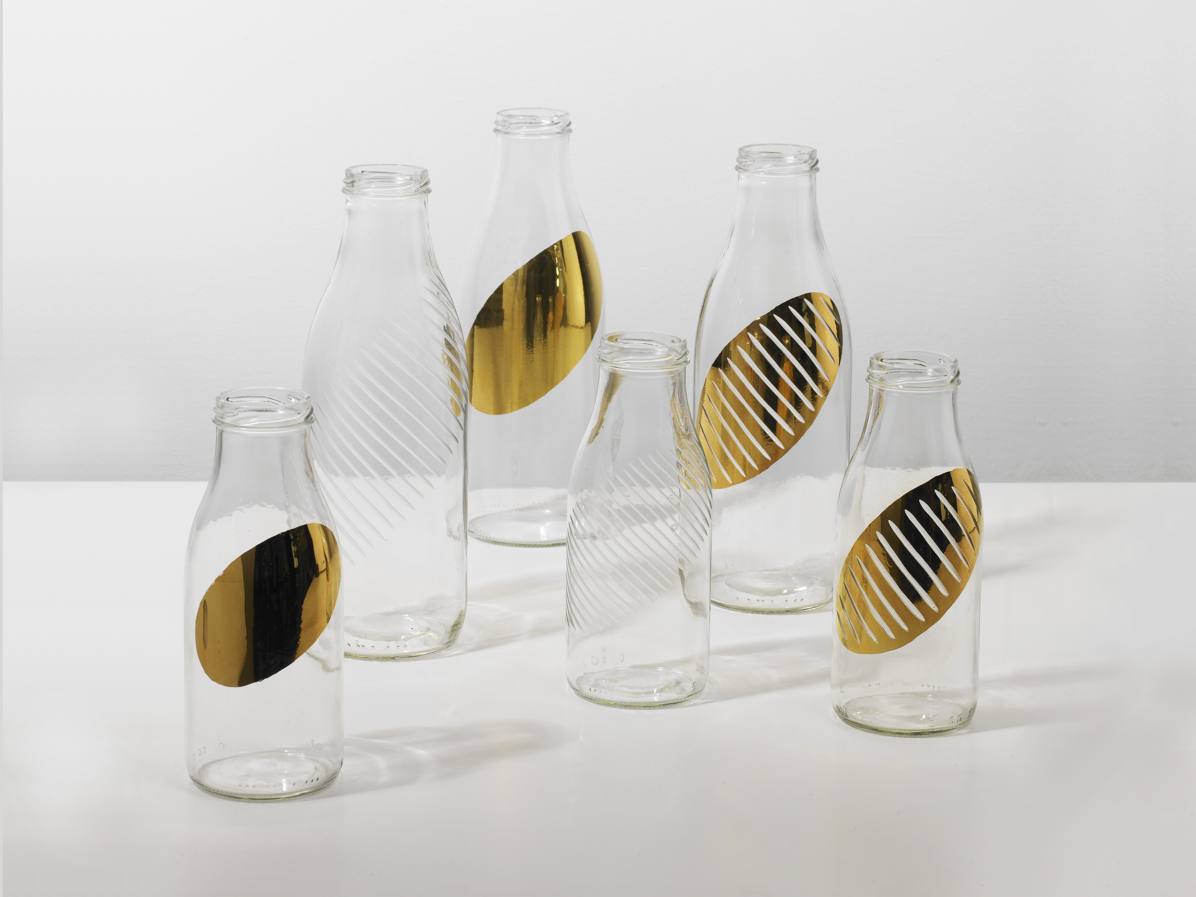 → All ProjectsDeveloped at Ecal, this project explore the traditional techniques usually used for crystal glass like cutting, engraving, gilding. I apply them on existing industrial glass packaging such as milk bottles or jars for tomato sauce. With this graphical “upgrade” I join together the industrial and the craft. I simply started by applying very traditional decorations that were later replaced by my personal “upgrades” inspired by the paper labels that takes part of this everyday objects and identify the product inside each bottle. This project was exhibited with Libby Sellers Gallery.