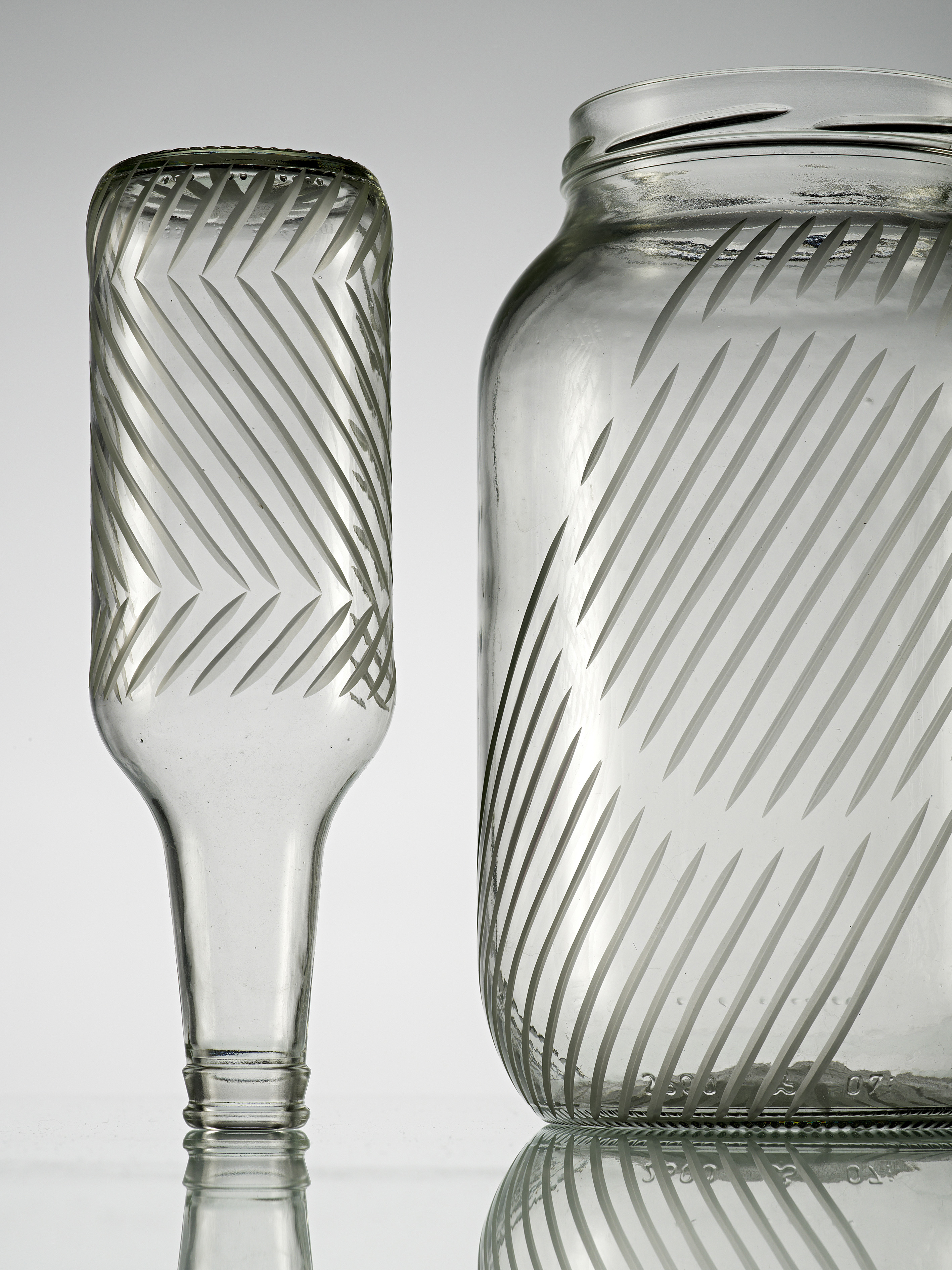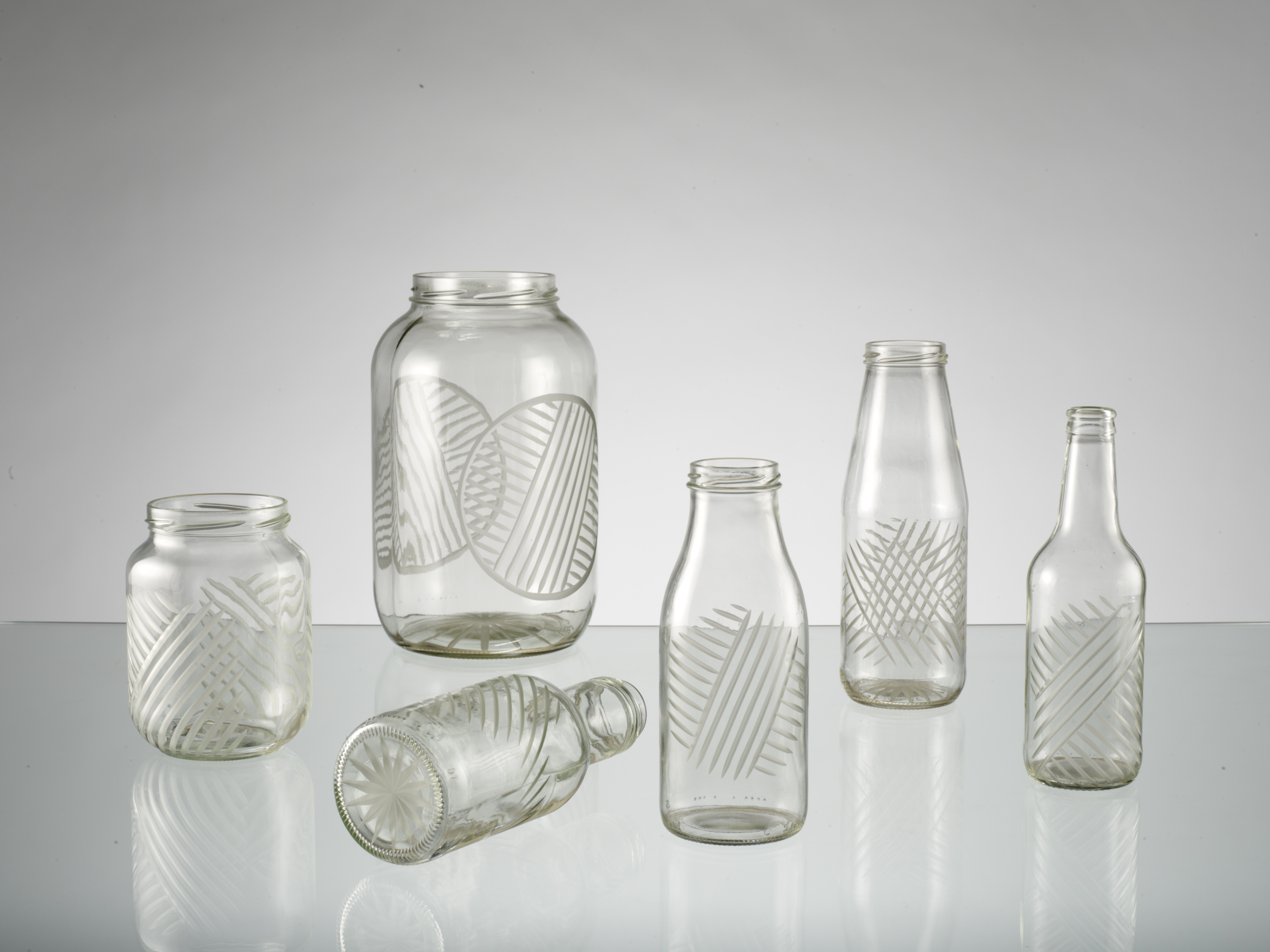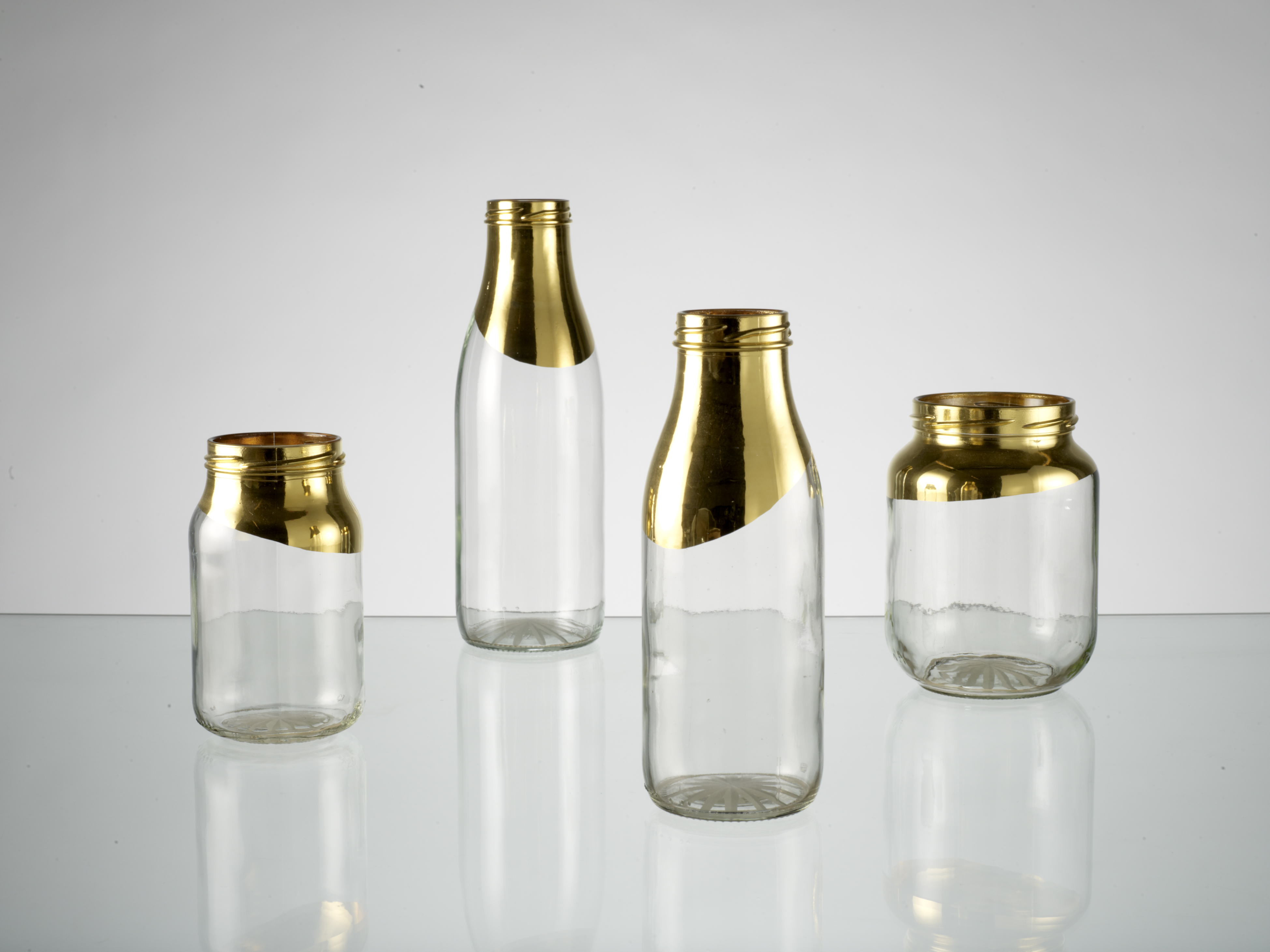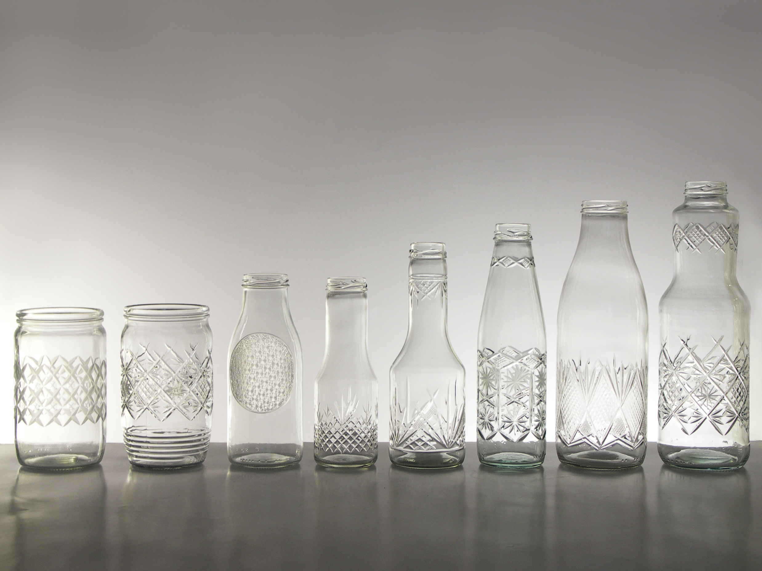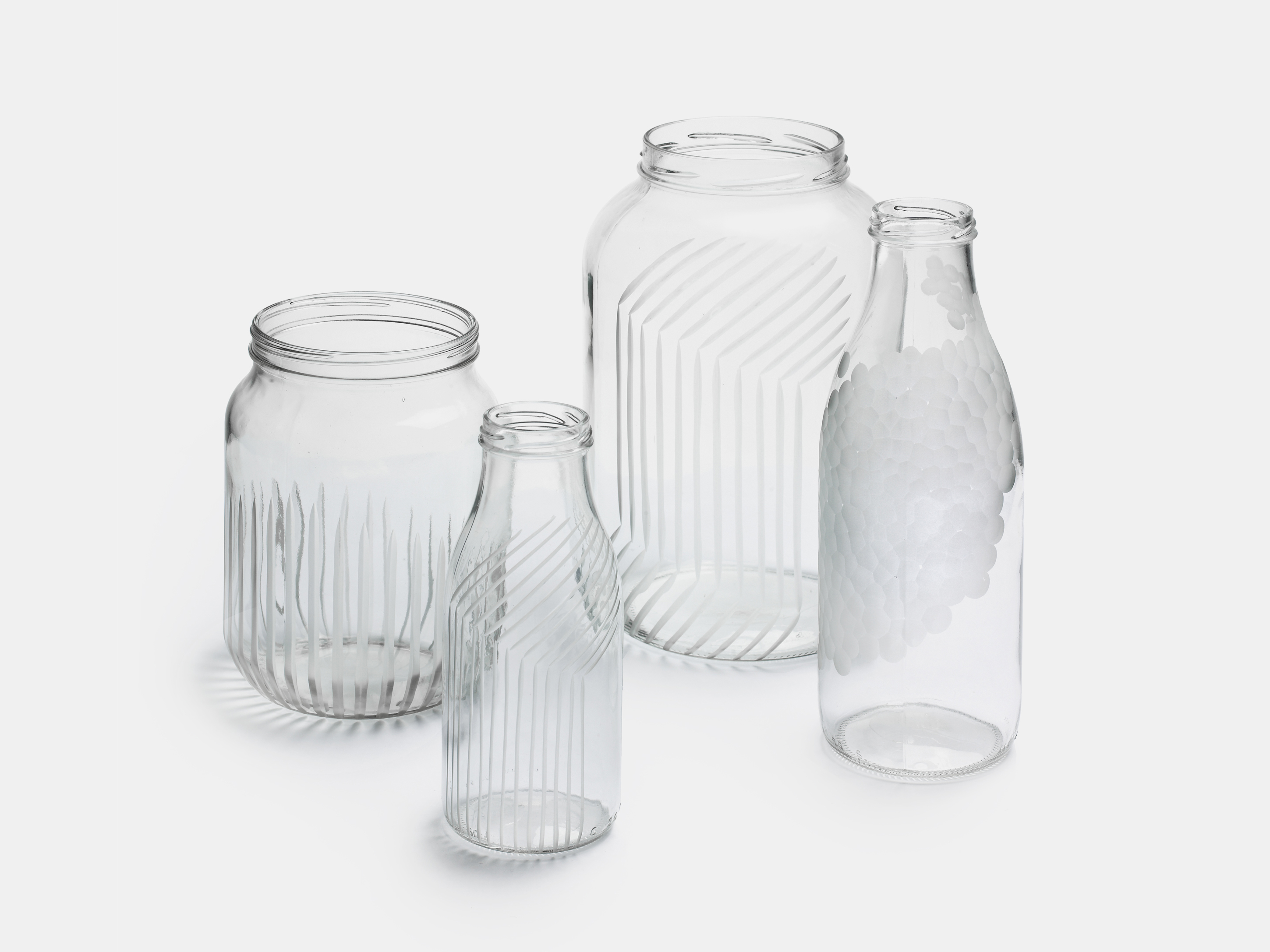 → All ProjectsDeveloped at Ecal, this project explore the traditional techniques usually used for crystal glass like cutting, engraving, gilding. I apply them on existing industrial glass packaging such as milk bottles or jars for tomato sauce. With this graphical “upgrade” I join together the industrial and the craft. I simply started by applying very traditional decorations that were later replaced by my personal “upgrades” inspired by the paper labels that takes part of this everyday objects and identify the product inside each bottle. This project was exhibited with Libby Sellers Gallery.